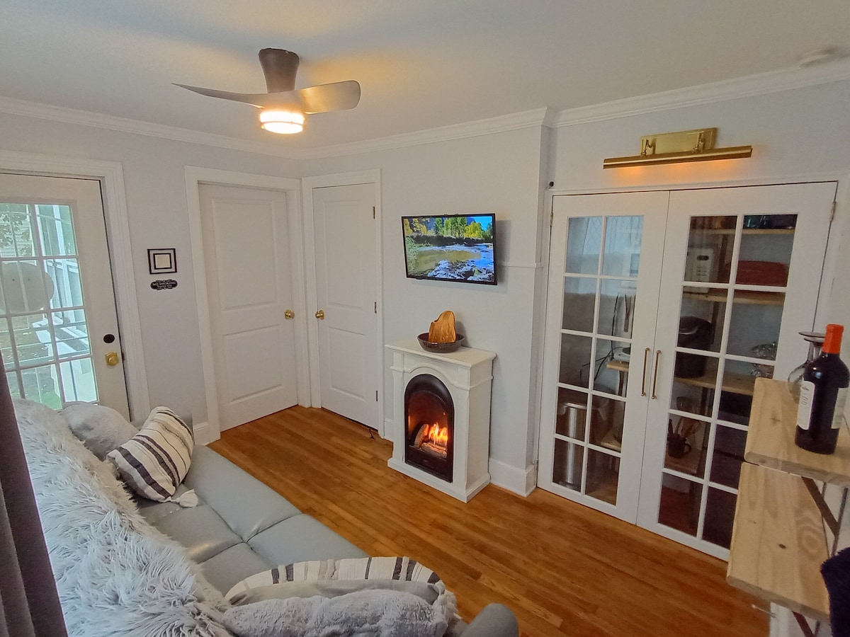 Kick back and relax in this calm, stylish space. This studio apartment offers fast internet, TV , a comfortable couch , a stylish new bathroom, a lovely kitchenette, as well as black out curtains in the bedroom. And a cozy warm fireplace. This apartment comfortably sleeps 1 adult or a couple. The couch folds out into a bed and there is bedding in a tote stored Under the bed.