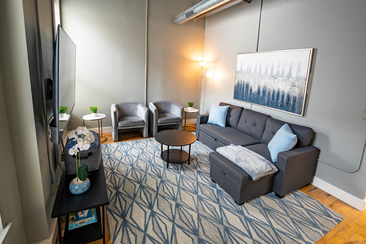 Downtown Grand Rapids loft Modern, una vida elegante con diseño de concepto abierto, suelos pulidos y todos los servicios de un hogar. Ubicación privilegiada, a poca distancia a pie de restaurantes, tiendas y atracciones. ¡Los huéspedes reciben un 10% de descuento en uno de los mejores bares de GR justo en la planta baja! Nuestro departamento de dos dormitorios también incluye un sofá cama, que te permite alojar cómodamente a 5 personas. Cocina totalmente equipada con utensilios, ollas y sartenes, platos, cuchillos, etc. ¡Café Keurig incluido! ¡Este es un espacio muy espacioso!