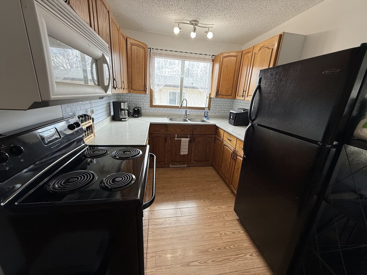 Welcome to your home away from home! This spacious main floor, 3-bedroom suite is the perfect retreat for families, groups, or anyone looking for comfort and convenience. Whether you're here for a vacation, newcomer or work-from-anywhere escape, our space has anything you need: 3 cozy bedrooms with comfy queen beds and fresh linens A fully equipped kitchen and a dining area A bathroom: bathtub/shower/fresh towels/toiletries Living room/fast Wi-Fi, smart TV and workspace Free laundry & parking