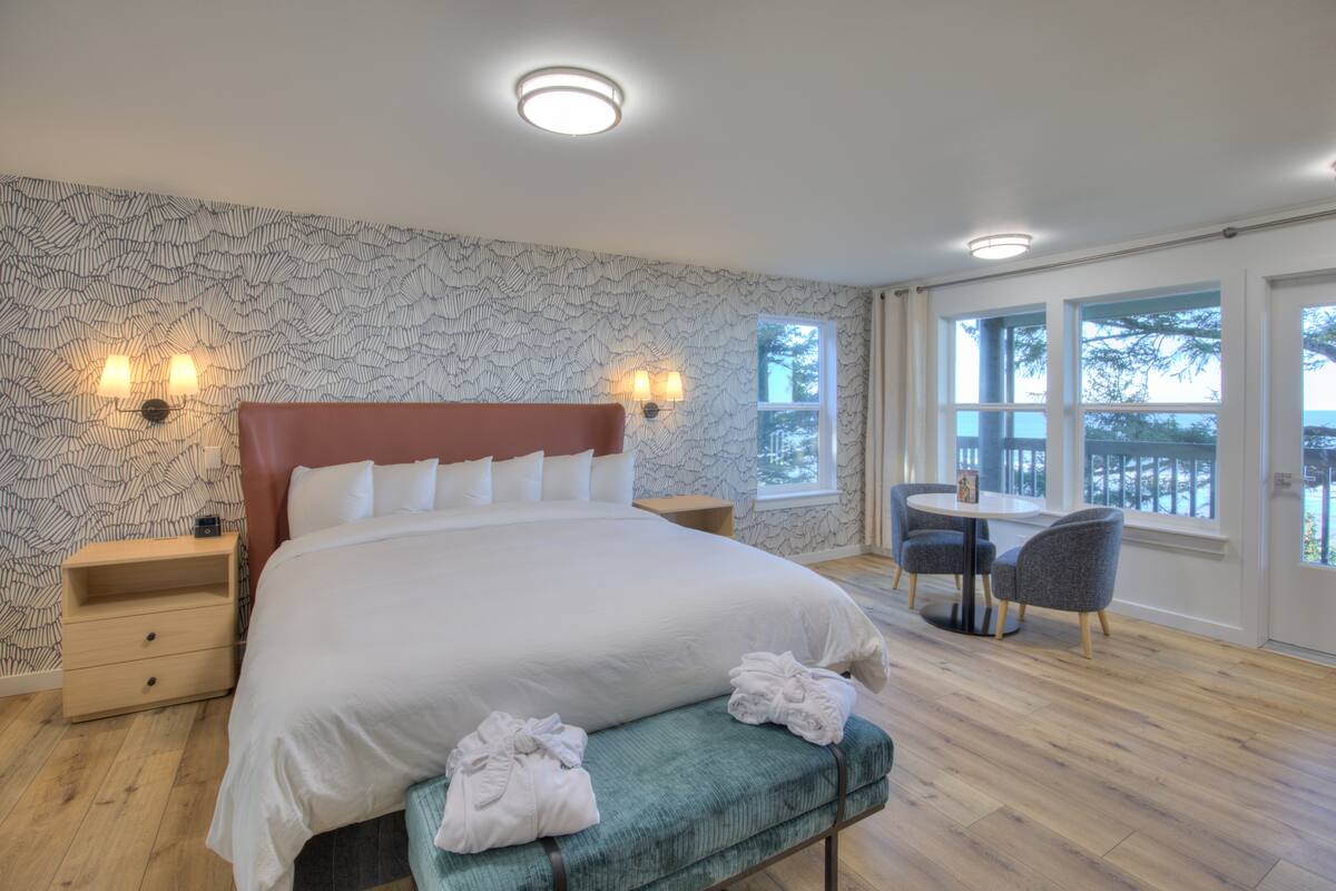 ¡Despiértate con impresionantes vistas al océano Pacífico! Este estudio renovado cuenta con una cama tamaño king y un balcón personal, el lugar perfecto para tomar tu café de la mañana. Disfruta de un microondas, mininevera, Keurig, TV de 65", aire acondicionado, cómodas batas, escritorio y asientos. Accede a la playa a través de las escaleras, además de disfrutar de nuestra piscina cubierta, bañera de hidromasaje y buena comida en el lugar. Tiene capacidad para 2 huéspedes (incluidos niños y bebés). ¡Ideal para excursiones de un día al Parque Nacional Olympic! Nota: La distribución de la habitación varía. Los vestuarios y la sala de ejercicios están cerrados.