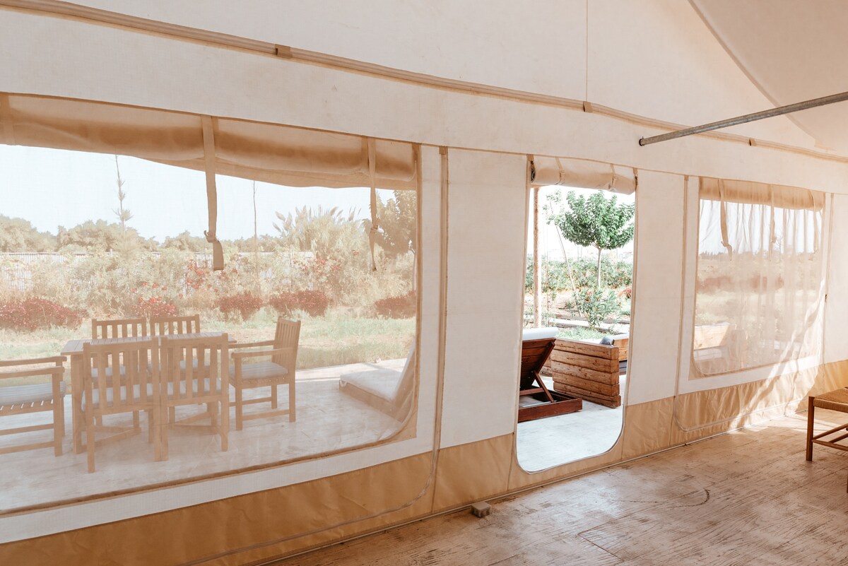 The bell tents are nestled between pistachio and olive trees. The bell tents are equipped with plush bedding, electricity and electric sockets with a plethora of usb ports, a pedestal fan and a clothes-hanger. We guarantee protection from nature creatures - mosquitos and bugs don't stand a chance with the 360-degree mesh wall and the mesh door. The luxurious shared toilets and showers are located just a few meters away from the tent. There is a private area with a picnic bench and a hammock.