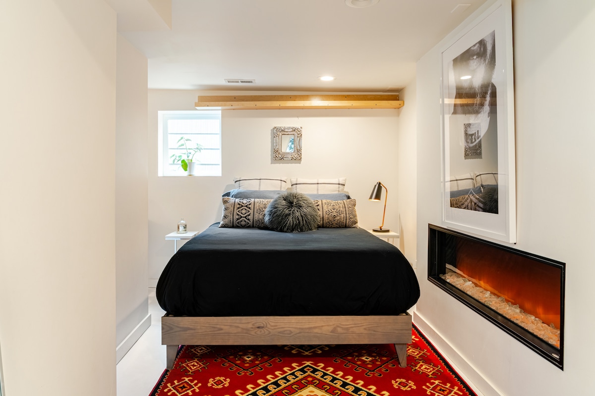 Disfruta de tus sentidos en este impresionante espacio de diseño de planta abierta (sin paredes) con más de 575 evaluaciones de cinco estrellas. ¡CAMPAMENTO BASE PERFECTO DE LA FIFA junto al tren ligero! Bañera de remojo grande, chimenea eléctrica, estación de trabajo remota y patio cubierto. * Este alojamiento está ubicado en la planta baja de nuestro alojamiento (pero una vivienda completamente separada). ESPERA escuchar actividades familiares diarias por encima de ti, como caminar y hablar. Si los sonidos del hogar te molestan, NO reserves este alojamiento. * No se permiten niños menores de 12 años