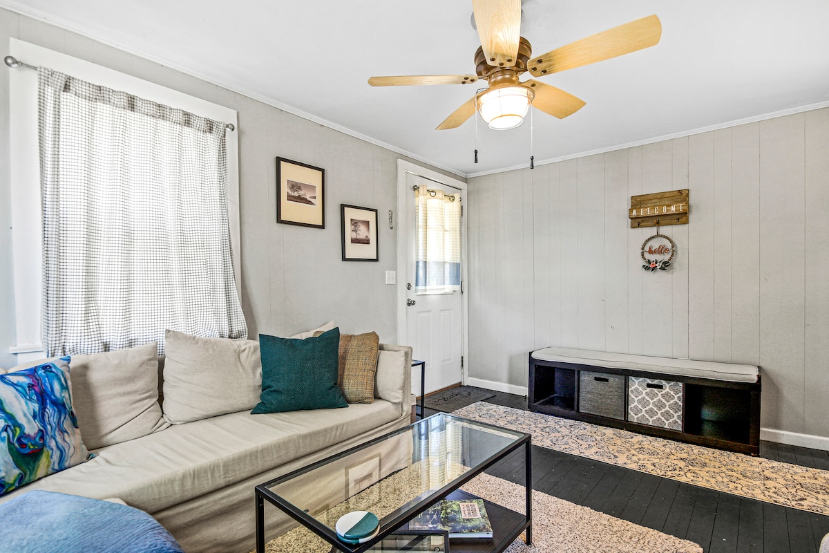 Construida a principios de la década de 1900, esta serena casa de campo se encuentra aproximadamente a una milla de la Universidad de Furman, en la base de Paris Mt. Ha sido mejorada con cariño, pero los suelos están un poco inclinados y ninguna esquina es exactamente cuadrada. Ubicada en un barrio en una granja de cinco acres, consta de tres habitaciones grandes, cómodamente amuebladas y con mucha luz natural. La casa es conveniente para ir al centro de Greenville (5 millas), Travelers Rest, Furman y Swamp Rabbit Trail. Sin comisión por mascotas ni gastos de limpieza.