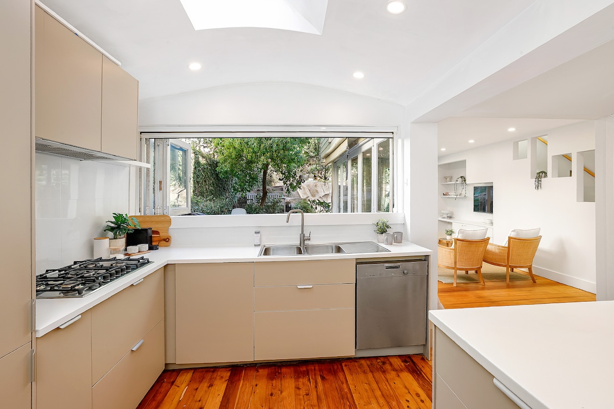 Siéntate en la terraza bañada por el sol de esta acogedora casa de época y disfruta de las vistas panorámicas de Green Park. Todas las habitaciones son espaciosas y cuentan con todo lo esencial para que te sientas como en casa. Como anfitriones con una familia joven, ocupamos parte de la propiedad y compartimos una pared común con la casa de huéspedes. Sin embargo, el AirBnB es privado, tiene entrada independiente y no comparte zonas comunes. Esta casa de huéspedes independiente forma parte de una elegante casa familiar de la federación en una manzana esquinera con su propia entrada privada. Tiene un dormitorio con armario empotrado y escritorio. La sala de estar es una sala de estar/comedor y cocina americana combinadas que conducen a una gran terraza exterior. El espacio es flexible y perfecto para viajeros de negocios, familias jóvenes y parejas que buscan disfrutar de las mejores partes de Sídney. Tenemos un colchón inflable y una cuna, que incluiremos o retiraremos en función de tus necesidades para dormir. ¡Te sentirás como en casa lejos de casa! Los huéspedes tienen un acceso privado separado sin zonas compartidas y acceso directo a Green Park desde la terraza exterior accesible a través de una entrada lateral. Esta propiedad admite el acceso sin llave con tecnología de August Home. Si lo deseas, no hay necesidad de interactuar con los residentes de la casa, el apartamento es tu espacio y es totalmente privado. Al otro lado de la carretera de la casa se encuentra Greens Park, que cuenta con un parque infantil, canchas de tenis públicas y aros de baloncesto. El campo de golf Cammeray también está prácticamente en la puerta, y hay una gran variedad de cafeterías, restaurantes y panaderías cerca. Cammeray es una excelente ubicación con acceso inmediato en todas las direcciones en coche. Hay mucho aparcamiento durante todo el día en la calle justo fuera de nuestro alojamiento. El transporte público es muy fácil en la ciudad, North Sydney y Mosman. Incluso está a poca distancia a pie de North Sydney, Neutral Bay y Crows Nest para trabajar o jugar. La cocina americana está equipada con nevera bar, microondas/horno, 2 placas de inducción, tostadora, jarra y artículos de primera necesidad.