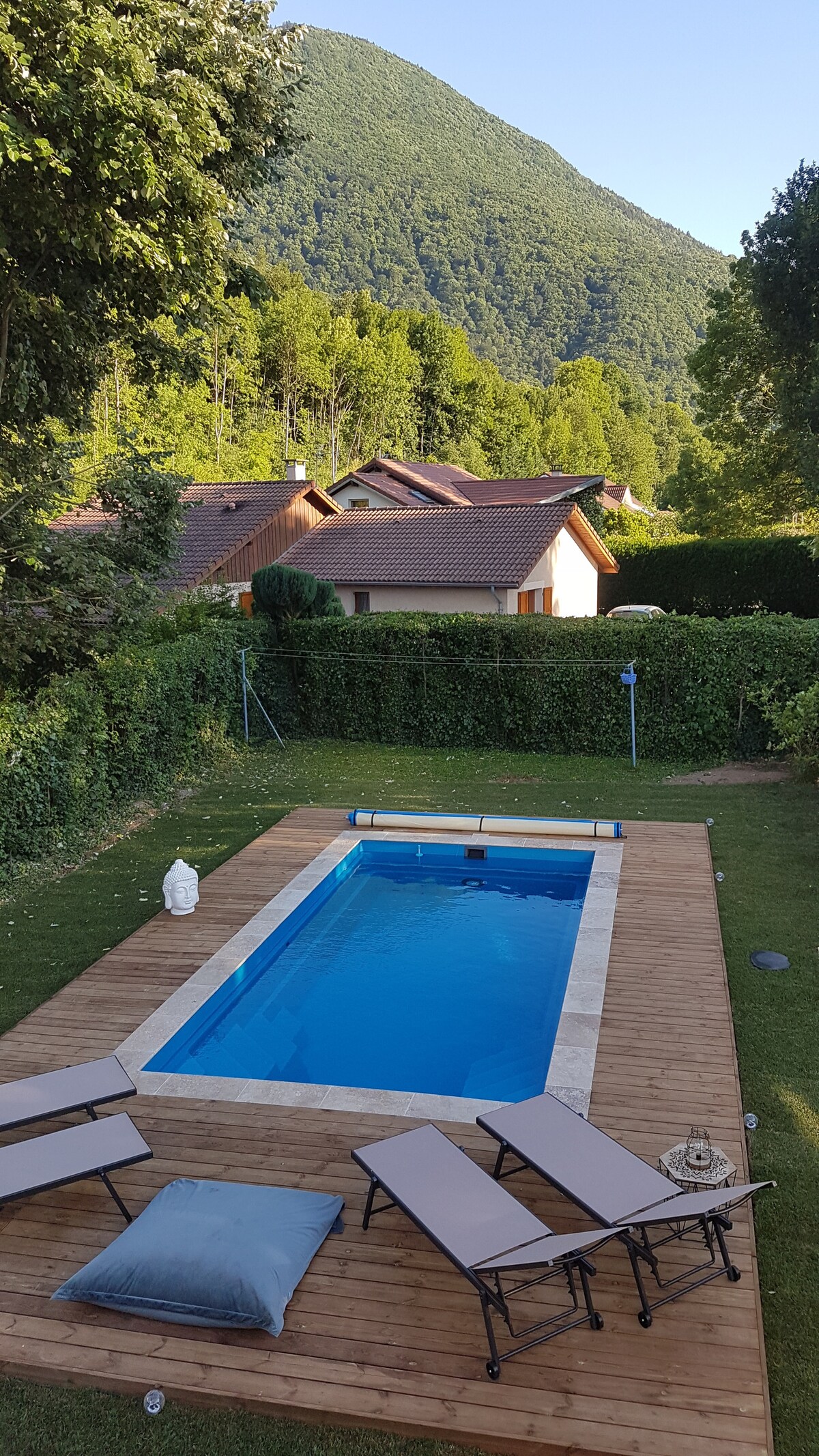 Acogedor estudio nuevo y funcional de 35 m² situado en la planta baja de una casa con entrada independiente y acceso directo a un gran jardín compartido con piscina de 6,50 x 3,50. Cama king size (+cama supletoria bajo petición), cuarto de baño, aseo, vestidor, pequeña sala de estar, cocina, cafetera, nevera, microondas, horno, placa de inducción, lavavajillas, TV, wifi. compromiso ideal entre paseos por la montaña y salidas por la ciudad. Grenoble 13 km, lagos Laffrey 7 km, Chamrousse 30 km Vizille Château 3 km