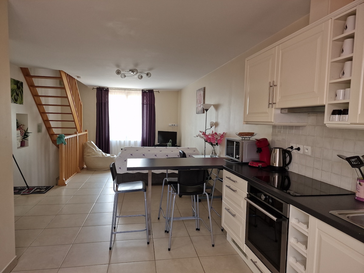 DUPLEX EN MAISON INDIVIDUELLE L'ENTRÉE: Grande pièce a vivre AVEC: Salon avec un: CANAPÉ convertible en un lit 1,40×190 TABLE BASSE, télévision. Cuisine AMERICAINE TOUTE ÉQUIPÉ AVEC LAVE VAISSELLE . SALLE D'EAU AVEC UNE DOUCHE 1,20×0,80 MEUBLE DE SALLE DE BAIN AVEC UNE VASQUE ET UNE GRANDE GLACE. WVC. ETAGE: 2 CHAMBRES. RANGEMENTS, TOILETTES AVEC WVC . internet et télévision SITUÉ A 5 KM de l'aeroport de ORLY ACCESSIBLE AUX TRANSPORTS EN COMMUNS, BUS ET TRAINS.