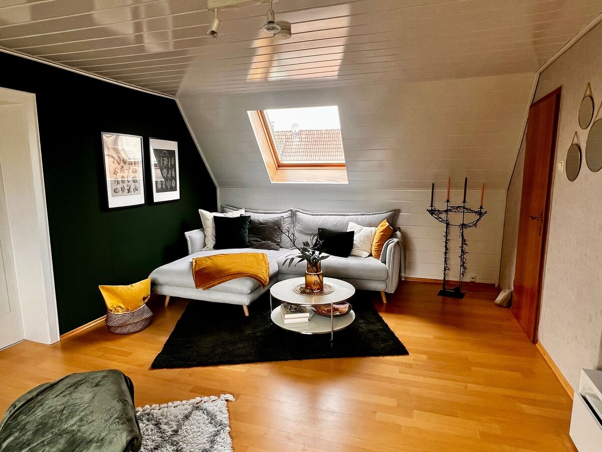 El apartamento del ático tiene una sala de estar incluida. Wifi y Smart TV, una zona para dormir para 2 personas, un baño y una pequeña cocina pequeña. Hay una cocina completa con lavadora, lavavajillas, horno y placa disponible en el sótano. En el jardín hay un área de estar en el estanque del jardín incl. Instalaciones de barbacoa. Estación de electricidad a 50m de distancia. Supermercado a diez minutos a pie. Parada de autobús a 2 minutos. Distancia Hildesheim a 10 minutos en AUTO.