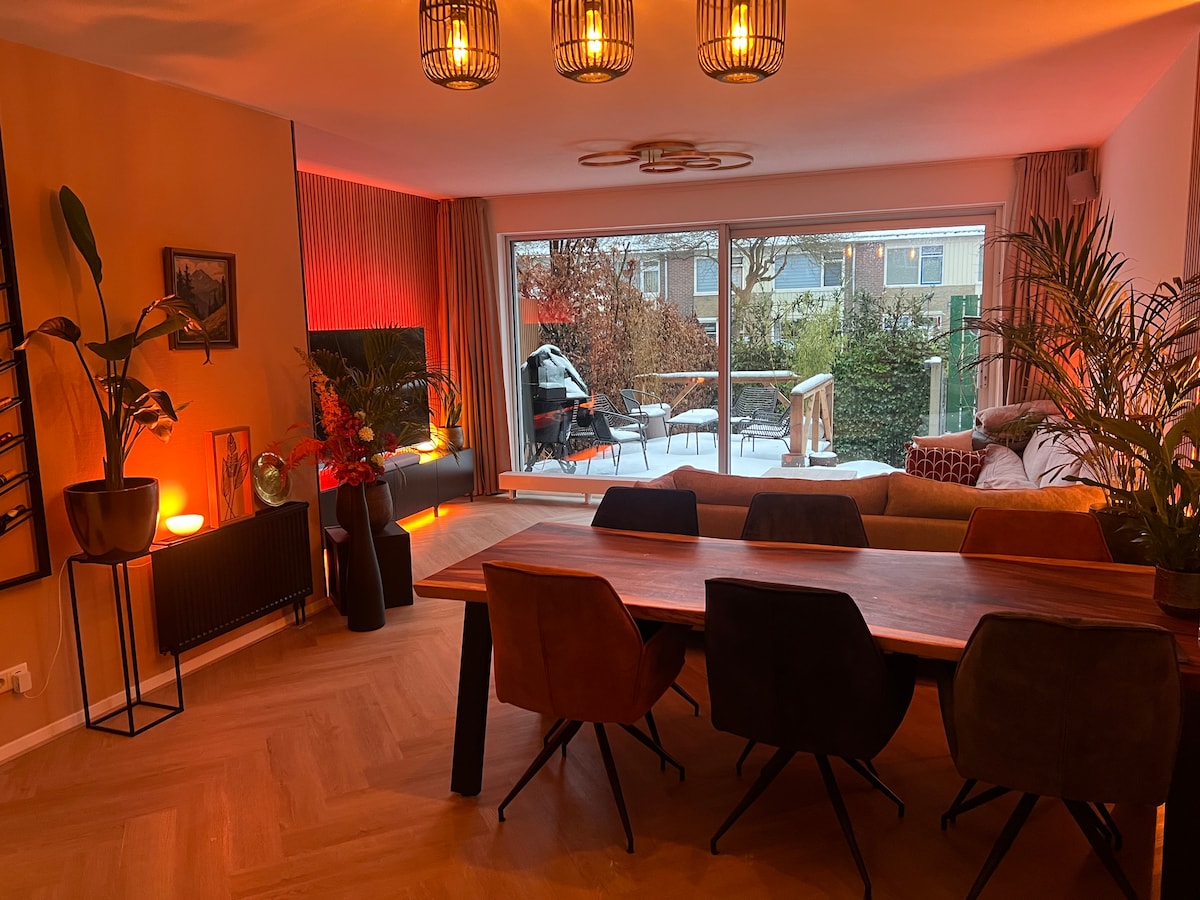 Sé bienvenido a mi encantadora casa de los años 30, recién reformada, cerca del centro de Groningen. La sala de estar tiene un gran sofá salón, TV y juego de dolby envolvente. La nueva cocina está equipada con todo, horno (combinado), cocina y cafetera. El acogedor dormitorio está amueblado con una encantadora cama de somier tamaño king. Disfruta de una deliciosa bebida en mi invernadero orientado al sur o en el jardín orientado al sur. O elige uno de los numerosos restaurantes a un tiro de piedra.