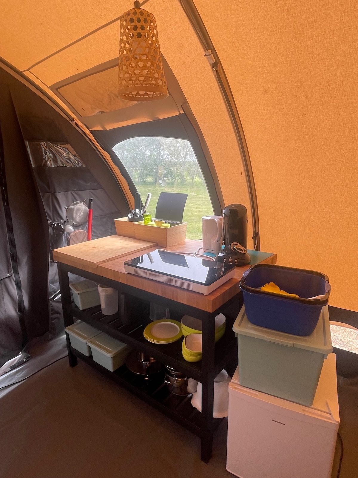 Nunca querrás salir de esta encantadora tienda. La tienda está totalmente amueblada, con una cocina completa y un "big green egg" para preparar las comidas más deliciosas. Si no tienes ganas de cocinar al final del día, ¡estaré encantado de hacerlo por ti! También quiero prepararte el desayuno mientras disfrutas del sol de la mañana y del canto de los pájaros. Hay una ducha y un inodoro en la granja a 20 pasos de distancia para tu propio uso.