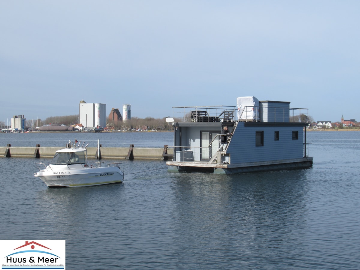 Aventura, relajación y exclusividad - La elegante casa de vacaciones Antje Frieda es una casa flotante, firmemente anclada en el puerto de Burgstaaken / Fehmarn. La característica especial de la casa flotante marítima amueblada es la terraza en la azotea completamente accesible y la vista gratuita del Mar Báltico y el puente Fehmarnsund. La casa flotante está diseñada para 5 personas y conecta la sala de estar con sus 2 terrazas para tomar el sol al este y al oeste con un diseño de habitación inteligente en un área de 56 metros cuadrados.