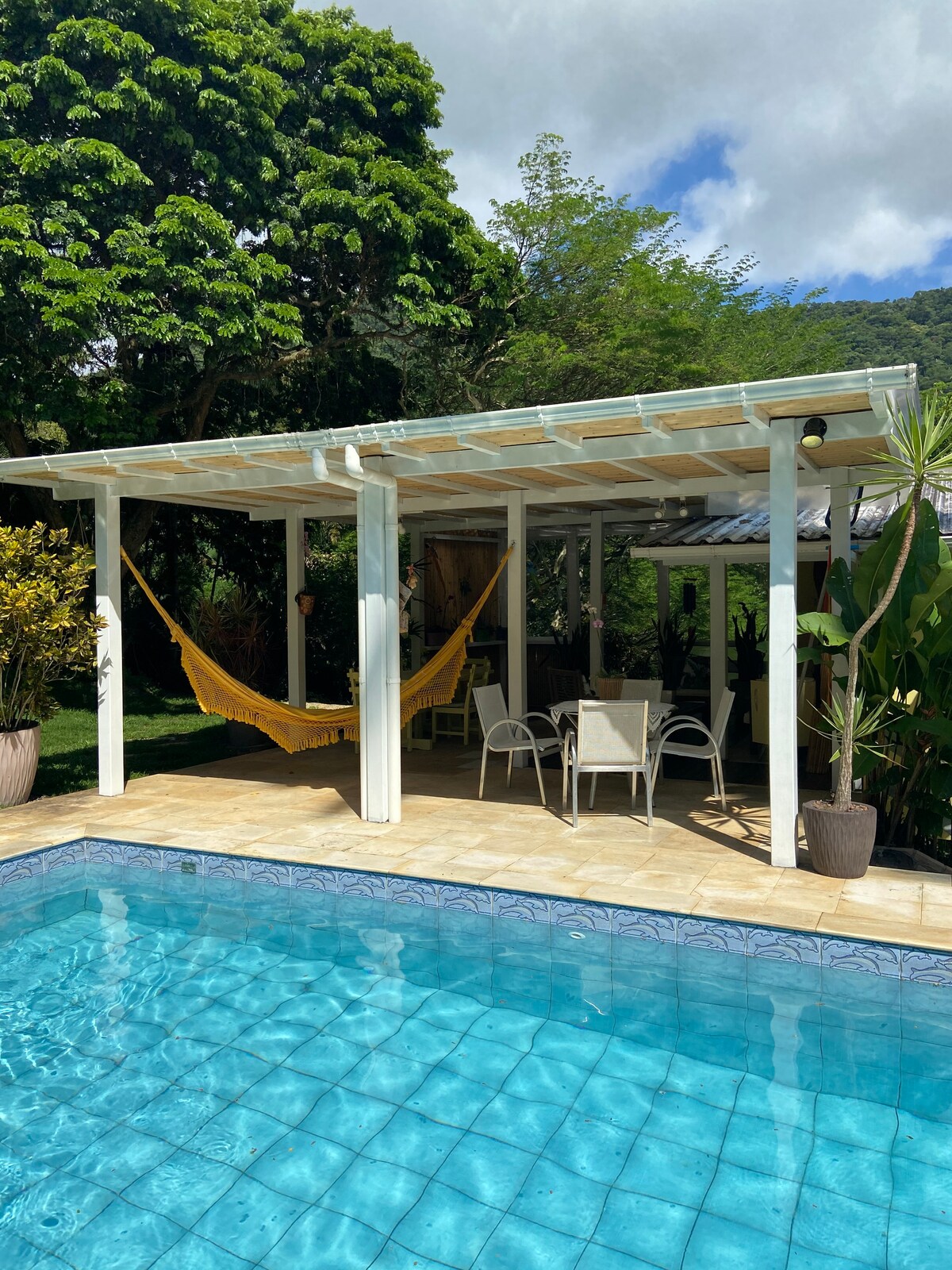 Diseño exclusivo. ¡Una experiencia única! Uno de los aspectos más destacados de la cabaña es la piscina climatizada (hasta 32 grados centígrados, controlada por Alexa). Es 100% privado y se puede usar en cualquier momento. Exuberante vista del bosque atlántico y el océano. Cascada a 20 minutos a pie de la casa. Condominio seguro. Cerca del centro gastronómico de Vargem Grande.