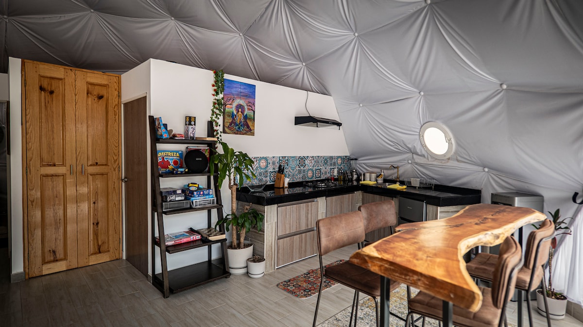 Un lugar ubicado a un kilómetro y medio de centro de Real de Catorce con el fin de que puedas disfrutar de todos los servicios y tranquilidad en un hospedaje que ofrece una gran variedad de comodidades y sin embargo una experiencia única para tu vista en Real de Catorce, este domo abre sus puerta en el año 2023 es completamente nuevo, equipado con cocina, dos habitacion un baño, sala en interior, asador al exterior y comedor. Los servicios principales como luz solar y agua caliente.