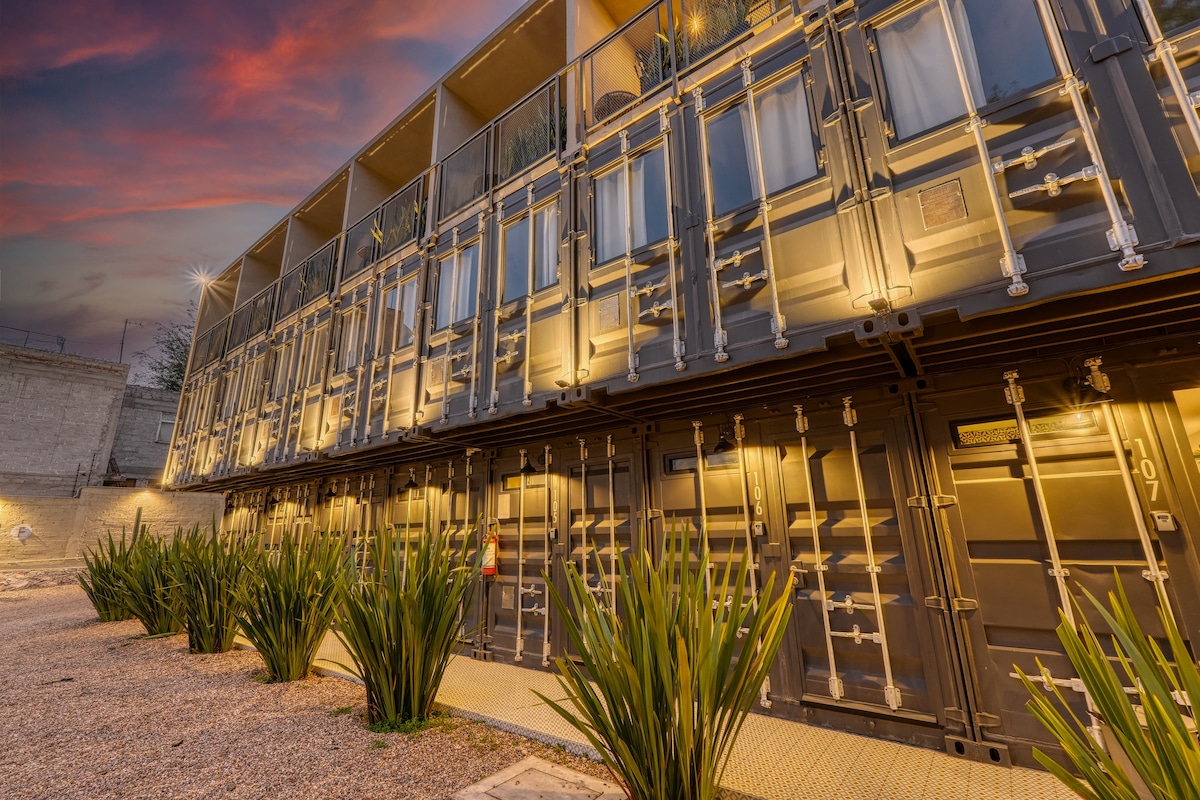 Descubre una suite hecha en contenedores marítimos una propuesta ecológica única en México desarrollada por el despacho Container Living. Disfruta de todas las comodidades, incluyendo aire acondicionado, estacionamiento gratuito dentro de las instalaciones, vistas a la ciudad y rápido acceso a las principales avenidas de la ciudad. Perfecta para viajes de trabajo o placer ya que es un lugar tranquilo y seguro, pero cuenta con todos los servicios a pocos metros de la propiedad.