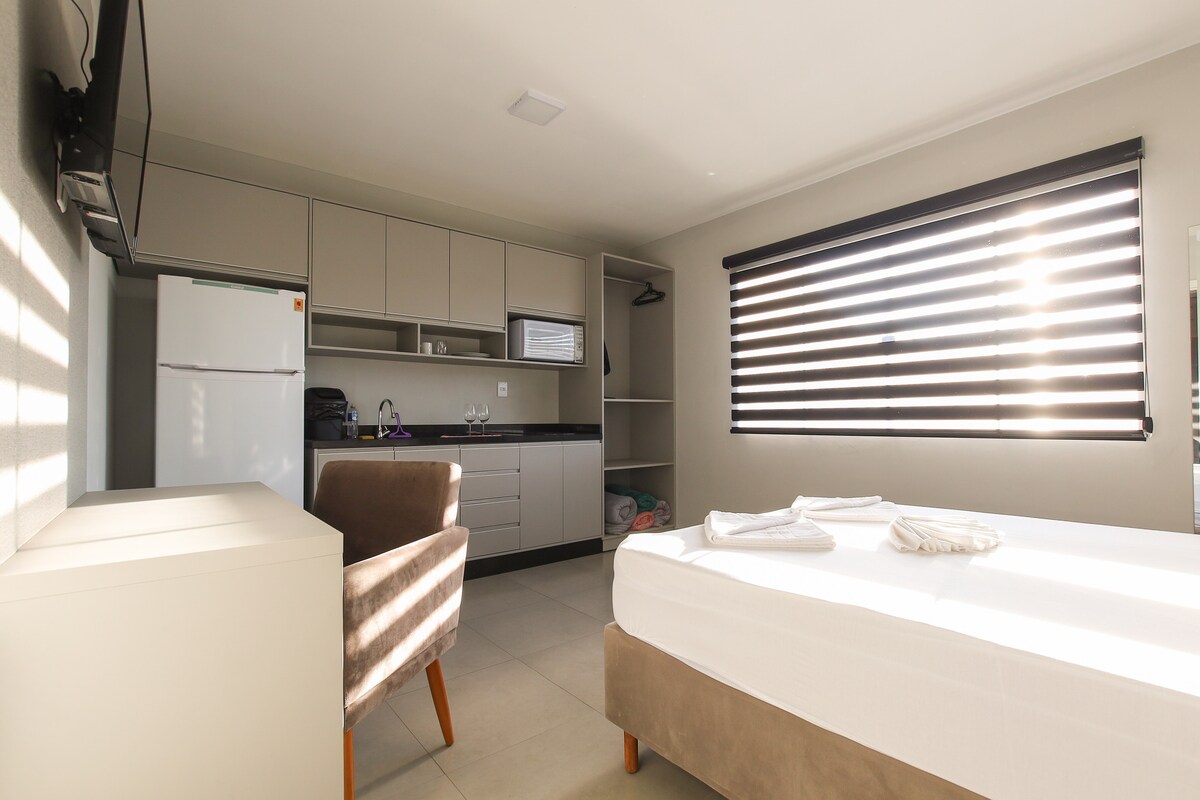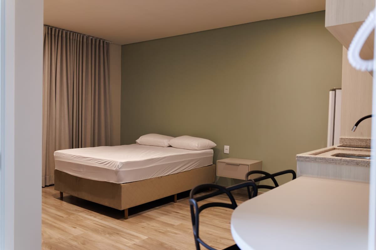 Loft moderno en el centro de Guarapuava, con cama tamaño queen, cocina completa, WiFi, TV inteligente y aire acondicionado frío y caliente. Cerca de restaurantes, supermercados, gimnasio y farmacias, perfecto para estancias prácticas y cómodas.