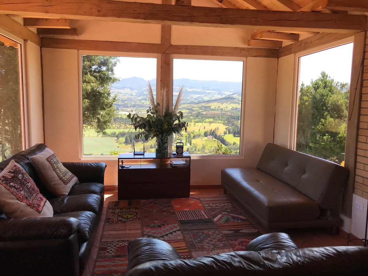 Estamos de vuelta, con una casa mejorada ! Para disfrutar en pareja, familia o con amigos. Espectacular vista, con los más hermosos atardeceres y tranquilidad absoluta. Casita perfecta para 2 a 6 personas, con dos cuartos, una sala grande, chimenea, bbq, fogata exterior en medio de 3 hectáreas de bosque nativo, cerca a la laguna de Guatavita. El plan perfecto para salir de la ciudad y conectarse con la naturaleza. Tenga en cuenta que el último tramo para llegar es una carretera destapada.