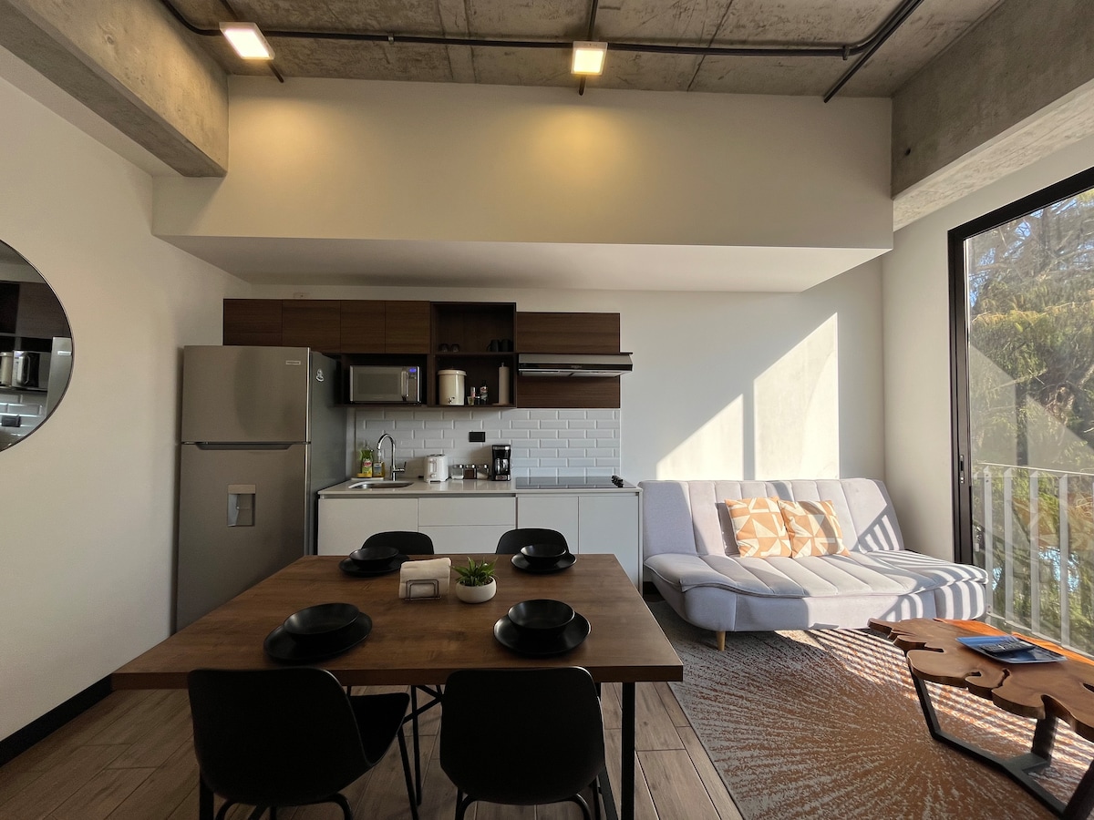Acogedora suite con estilo en plena zona 10, a pocos pasos de centros comerciales, restaurantes, hospitales, universidades, aeropuerto y los principales edificios corporativos de la ciudad. Suite con una lujosa decoración, balcón, WiFi, Smart TV y baño completo privado, cocina equipada y parqueo seguro en el sótano del edificio. Áreas comunes con piscina, gimnasio, juegos para niños y varias amenidades mas.