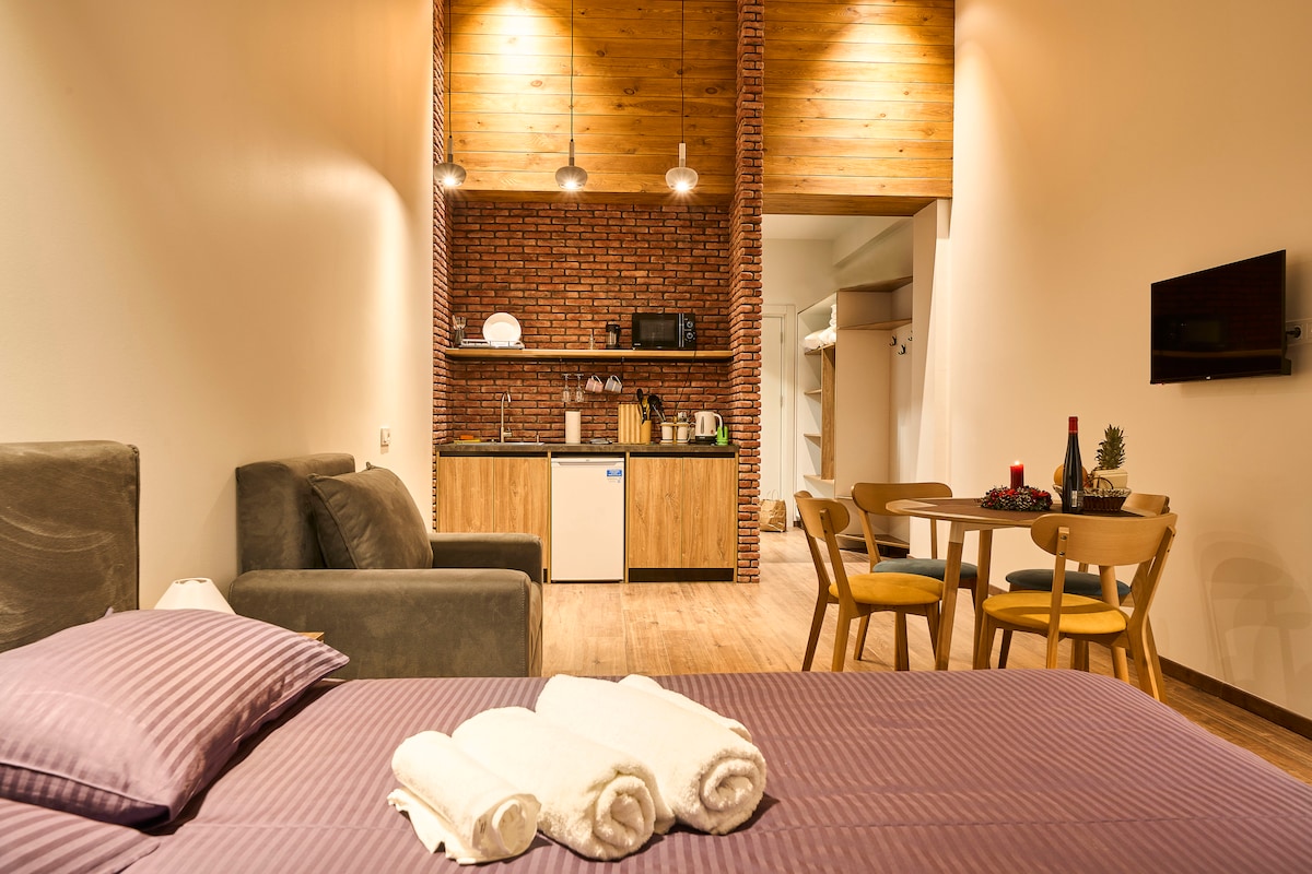 Este hermoso apartamento se encuentra en el corazón de New Gudauri, a poca distancia a pie del telesilla principal, ¡«Góndola»! Una cama tamaño queen con colchón que favorece el sueño y un cómodo sofá de matrimonio, con una cocina americana totalmente equipada para cocinar en casa, juegos de mesa y un ambiente acogedor increíble.