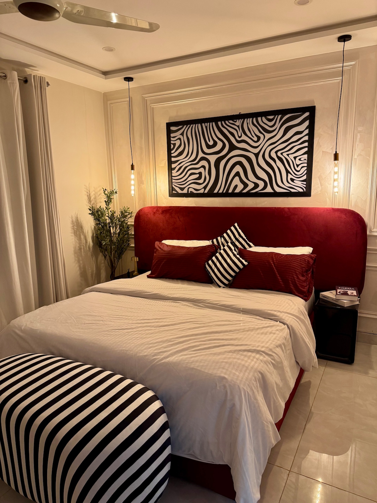 Experience designer living at Luniq, just steps from MM Alam Road the heart of Lahore’s cafes, boutiques, and nightlife. • 🛋️ Aesthetic lounge with cozy rugs, hanging lamp & full-length curtains • 🛏️ Plush king-size bed with premium bedding & city views • 55” Android Smart TV with Netflix & YouTube Premium • 🍳 Fully equipped modern kitchen with essentials • ⚡ Fast Wi-Fi for work or streaming • 🔑 Seamless self check-in for complete privacy • 🌆 Prime Gulberg location