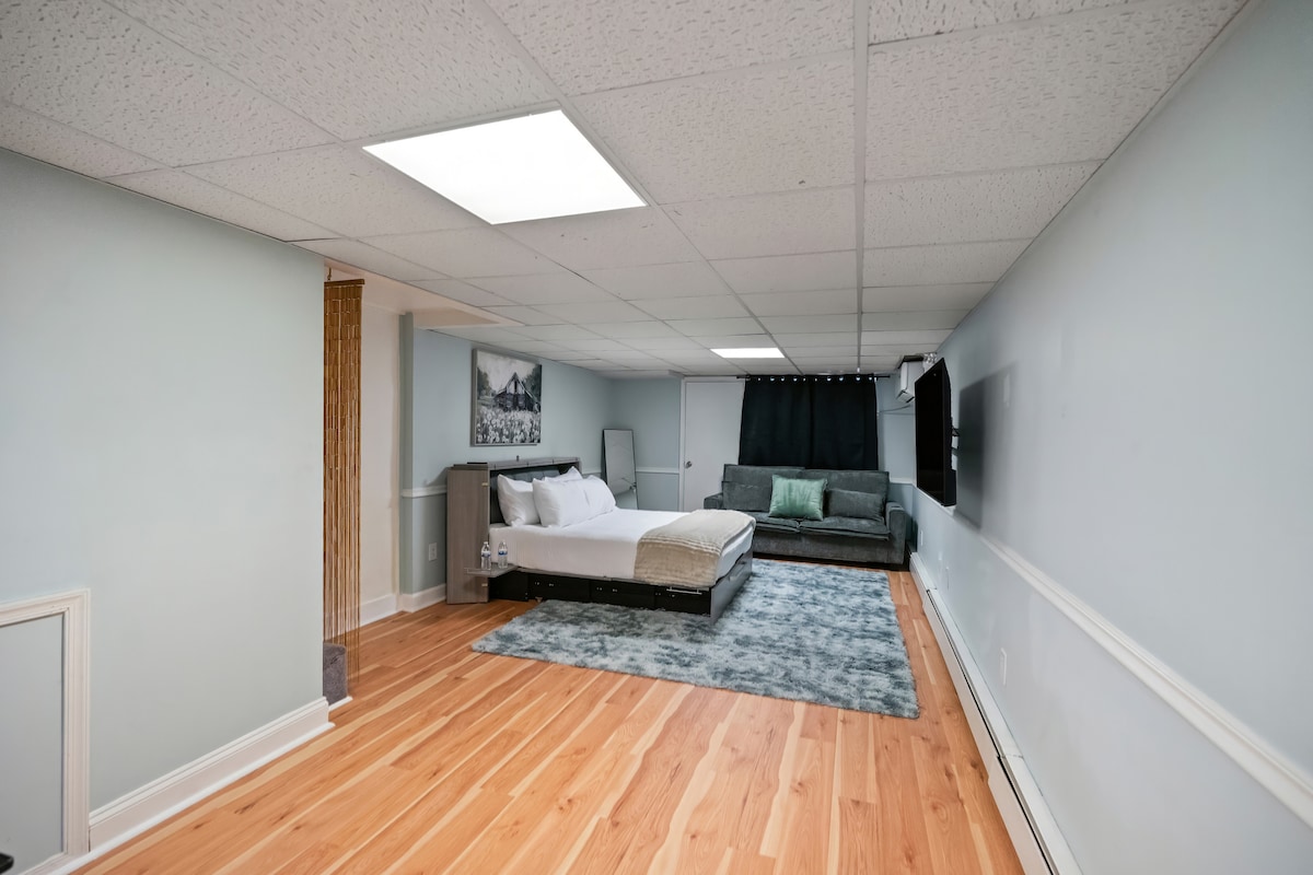 Este es un espacioso nivel inferior de una casa de nueva construcción. Esta zona privada para huéspedes cuenta con salón, comedor y cocina americana, además de un dormitorio y un baño. Los huéspedes solo comparten la entrada principal de la casa adosada con los propietarios que viven arriba. Este espacio privado decorado incluye un televisor inteligente, asientos cómodos, comedor para 4 personas, microondas, cafetera, nevera completa, tostadora/freidora de aire, cama tamaño queen, armario y cómoda. Hay lavadora/secadora disponibles bajo petición. Revisa las normas de la casa antes de reservar.