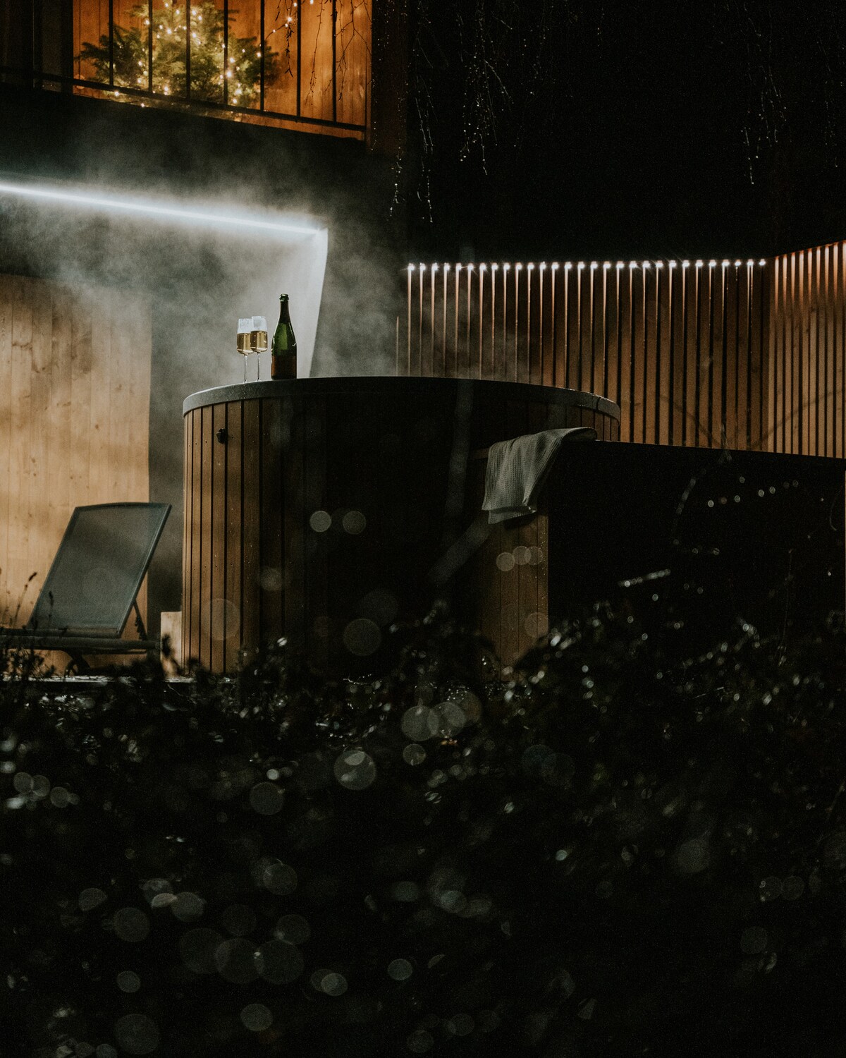 ¿Cuco, tubing, sauna, senderismo, mimos, cine? Tú decides. El diseño moderno se encuentra con la comodidad en un entorno tranquilo. La casa ha sido diseñada con un sinfín de minuciosidad para satisfacer todas las necesidades. Nuestra bañera climatizada con electricidad tiene un control de temperatura que se puede controlar desde el teléfono para que no tengas más que disfrutar del agua caliente. Nuestra sauna para 2 personas tiene una sala de relajación separada donde puedes recuperarte entre sudores. También puedes disfrutar de una película mientras estás acostado en la cama.