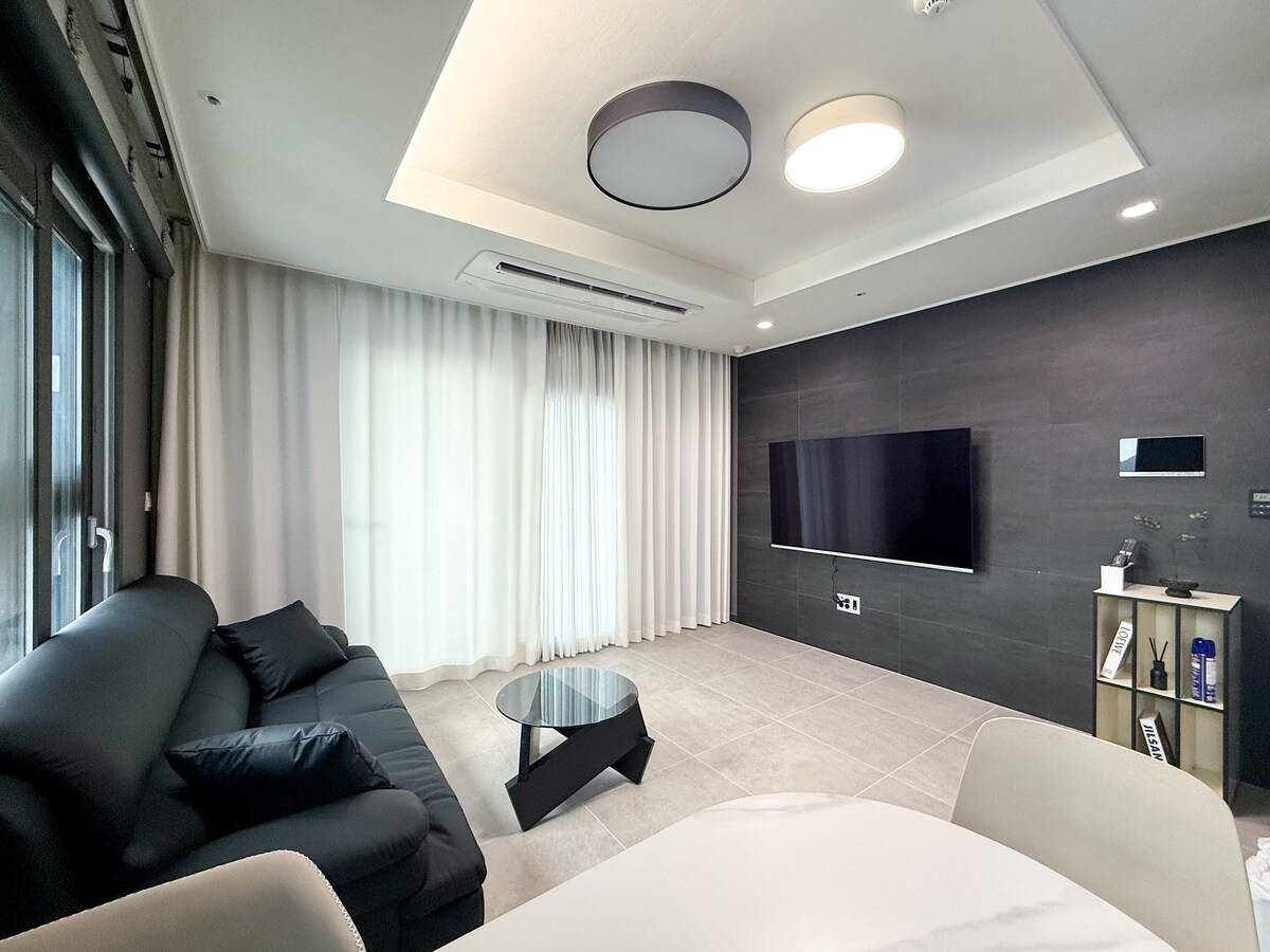 Esta es The House, un elegante alojamiento emocional de una habitación cerca de Haeundae Beach. La playa de Haeundae está a 3 minutos❤️ a pie. Es❤️ una vista a la ciudad y se puede ver la vista al mar desde la terraza. Este es un alojamiento de una habitación❤️ para 2 personas. ❤️ El interior, los muebles, la decoración y el estilo te harán sentir acogedor y cómodo. ❤️Instalaciones - Televisor inteligente portátil LG de 55 pulgadas (Netflix disponible) (inicio de sesión de cuenta personal), aire acondicionado, refrigerador, microondas, hervidor eléctrico, 1 cama tamaño queen, cortina de oscurecimiento sensorial, purificador de agua fría y caliente Woongjin Conway, máquina de cápsulas de canoa, inducción Samsung - Champú/acondicionador/jabón corporal/lavado de manos, toallas, etc. ※ Debido a la política ambiental, no proporcionamos cepillo de dientes ni pasta de dientes.