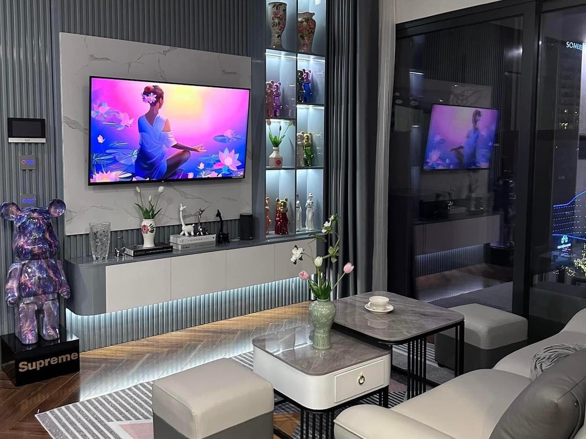 Un nuevo apartamento decorado con posicionamiento de estilo boho Chic justo en el piso 32 de Doji Diamond Crown Tower, una nueva torre de lujo de Hai Phong. La propiedad cuenta con vistas increíbles (puedes ver fuegos artificiales todos los sábados por la noche alrededor de las 7:00 p. m.) , excelentes servicios públicos (supermercado a 2 minutos, muchos restaurantes y cafeterías alrededor) y una ubicación perfecta (a 15 minutos del aeropuerto).