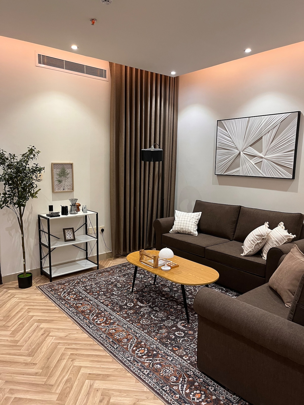 Disfruta de una estancia excepcional en este lujoso apartamento que combina el carácter moderno y la identidad cultural de la región de Qassim. Está cuidadosamente diseñado para darte una sensación de calidez y pertenencia, a través de detalles decorativos inspirados en colores y formas elegantes, mezclados con sofisticados toques de hotel. El apartamento tiene 3 dormitorios elegantes y cómodos, una cocina totalmente equipada con todas las herramientas y electrodomésticos necesarios para preparar tus comidas cómodamente, además de una elegante sala de estar con muebles de lujo que reflejan el espíritu del lugar, y tres baños modernos con elegantes acabados que proporcionan el máximo confort y privacidad.