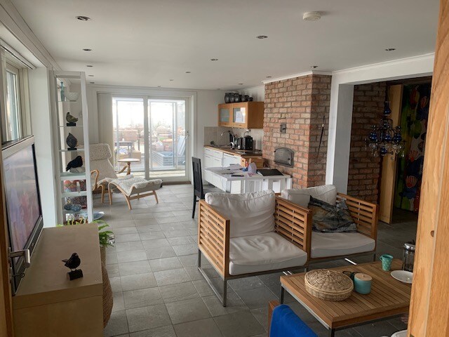 Un dormitorio en la planta baja con cama de matrimonio y un nuevo dormitorio en el ático con una cama doble y una cama que también funciona como sofá. Espacio al aire libre con vistas al mar sin obstáculos y muebles de exterior. Desde el apartamento se puede ver el mar y caminar unos 100 metros hasta el mar. A 5 minutos a pie junto al mar se obtiene la hermosa playa de arena de Ranarpsstrand, que también alberga un campo de tenis y una piscina.