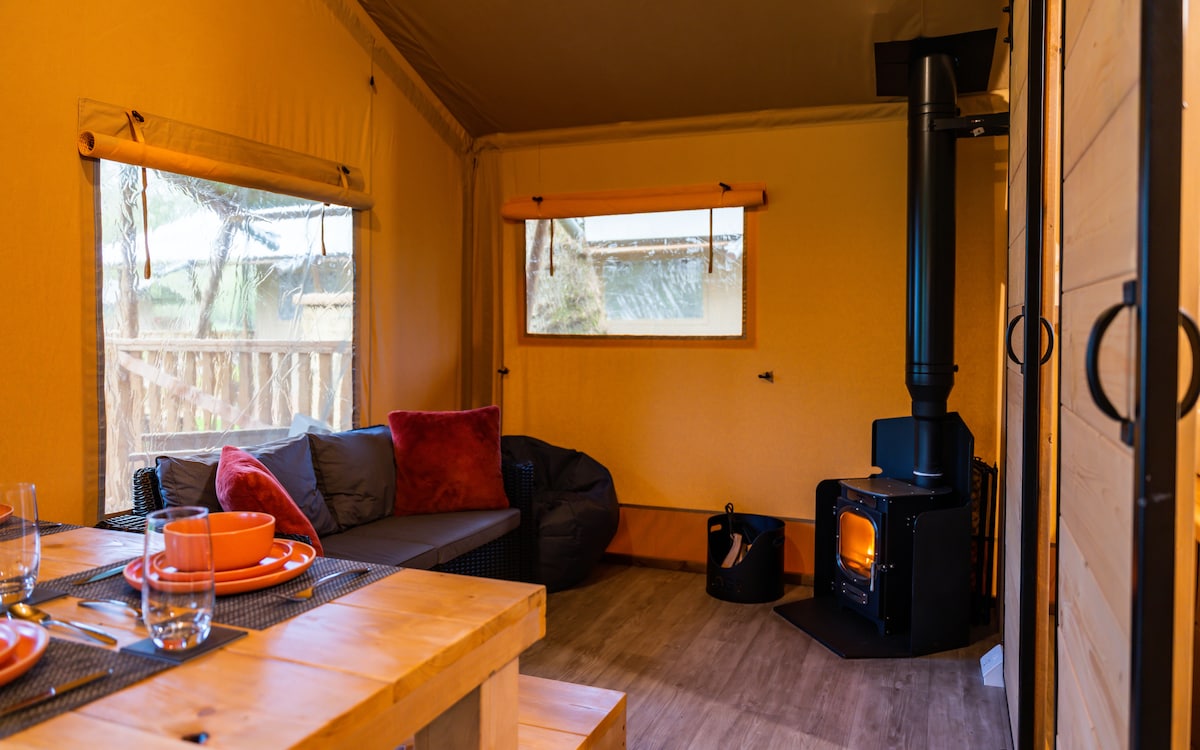 Escápate a la naturaleza en nuestra tienda de safari totalmente amueblada, un refugio rural perfecto para familias y grupos pequeños. Con capacidad para 5 huéspedes en 3 acogedoras habitaciones (2 camas tamaño king y 1 individual), hay mucho espacio para relajarse. En el interior hay una cocina bien equipada con fogones de gas, agua corriente caliente, fregadero y nevera. La sala de estar y el comedor de planta abierta ofrecen cómodos asientos, una gran mesa de granja y una estufa de leña. Entra en tu terraza privada, ideal para el café de la mañana o los atardeceres.