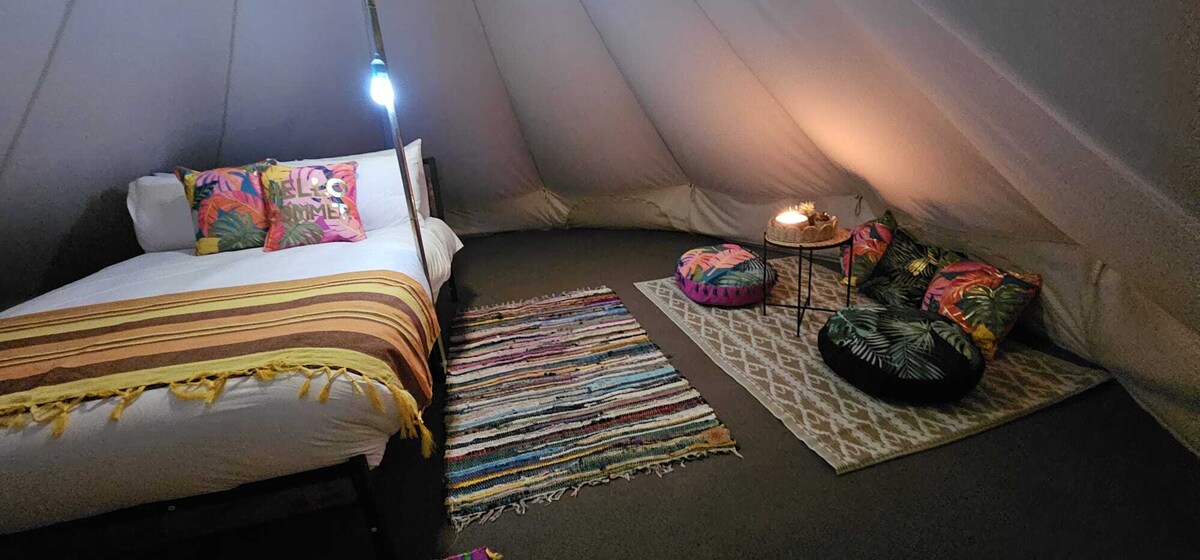 La hermosa tienda de campaña Jungle Bell de 6 metros tiene capacidad para 2 adultos SOLAMENTE en una cama doble y hasta 4 niños en camas extraíbles. Todo lo que necesitas para una estancia independiente está incluido: toallas, ropa de cama, equipo de cocina, comedor y lavado, estufa de leña y nevera portátil. Instalaciones privadas justo al lado con ducha caliente y baño con descarga. En el exterior hay un área de cocina encubierta con estufa de gas y barbacoa de carbón, chimenea y asientos. Los huéspedes también tienen acceso a un refrigerador con congelador y puntos de energía en el lugar.