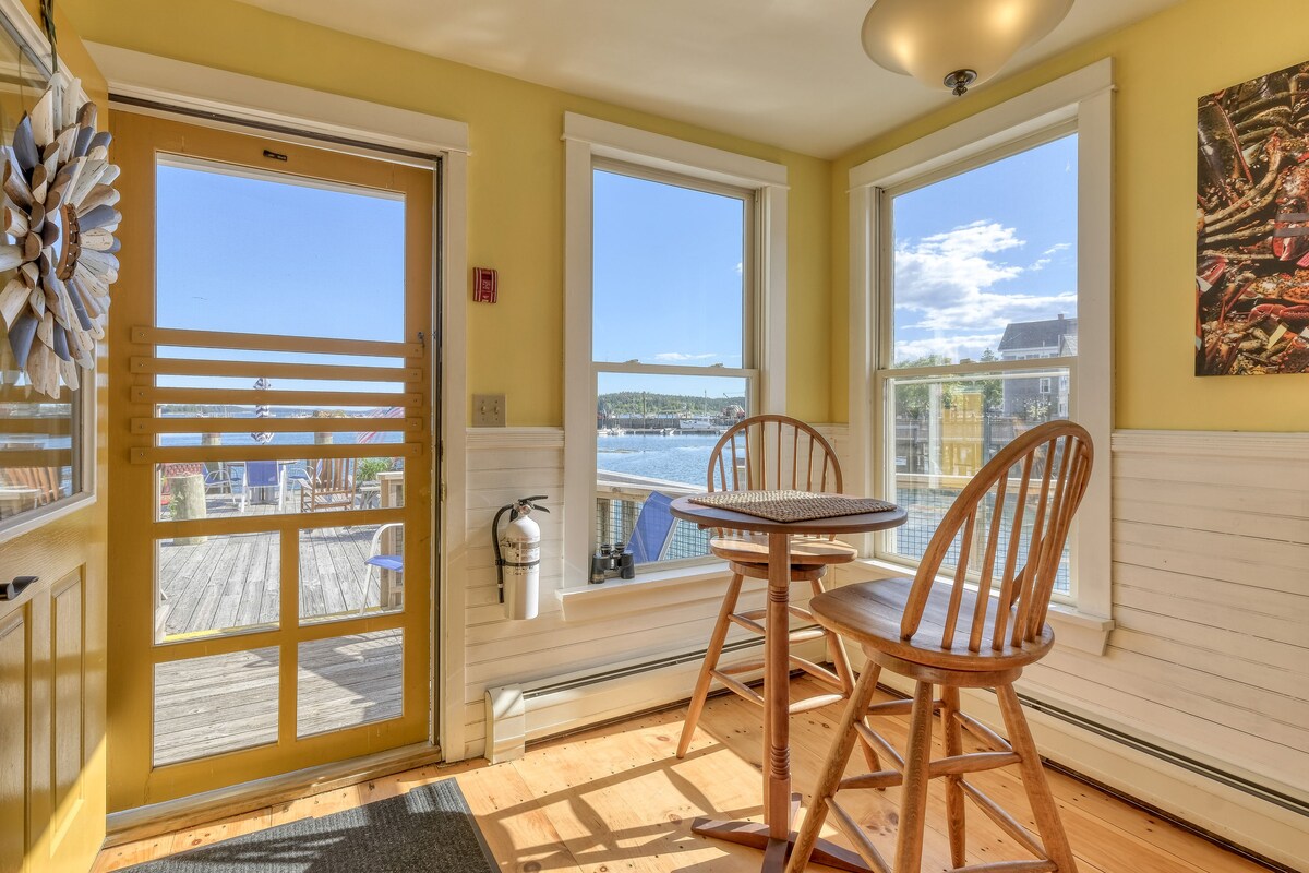 Welcome to Inn on the Harbor - Stonington: The Timberwind is a lovely 2nd-floor room perfect for two with a queen bed, full bath, hairdryer, tv with cable, free wifi, microwave, small fridge, and perfect sitting space and a large window overlooking stunning harbor views allowing for the ultimate peaceful oceanside relaxation.