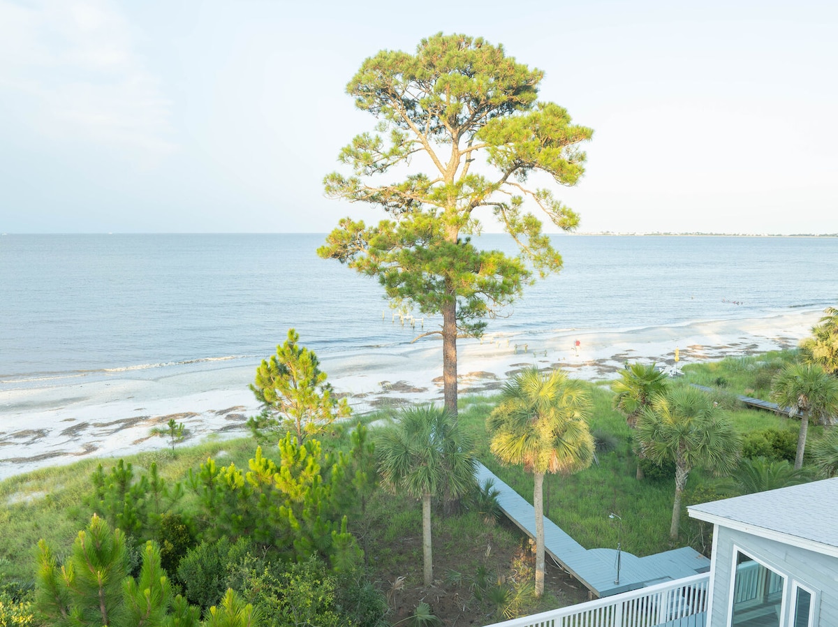 Secluded Shoreline Retreat on a private natural beach. As you step onto the property, you'll be greeted by the soothing sounds of the waves and the gentle rustling of leaves in the breeze. The expansive deck, perched high among the trees, provides a breathtaking panoramic view of the pristine beach and low country waters beyond. It's a vantage point that feels like a secluded treetop retreat, with the added bonus of direct beach access just steps away.
