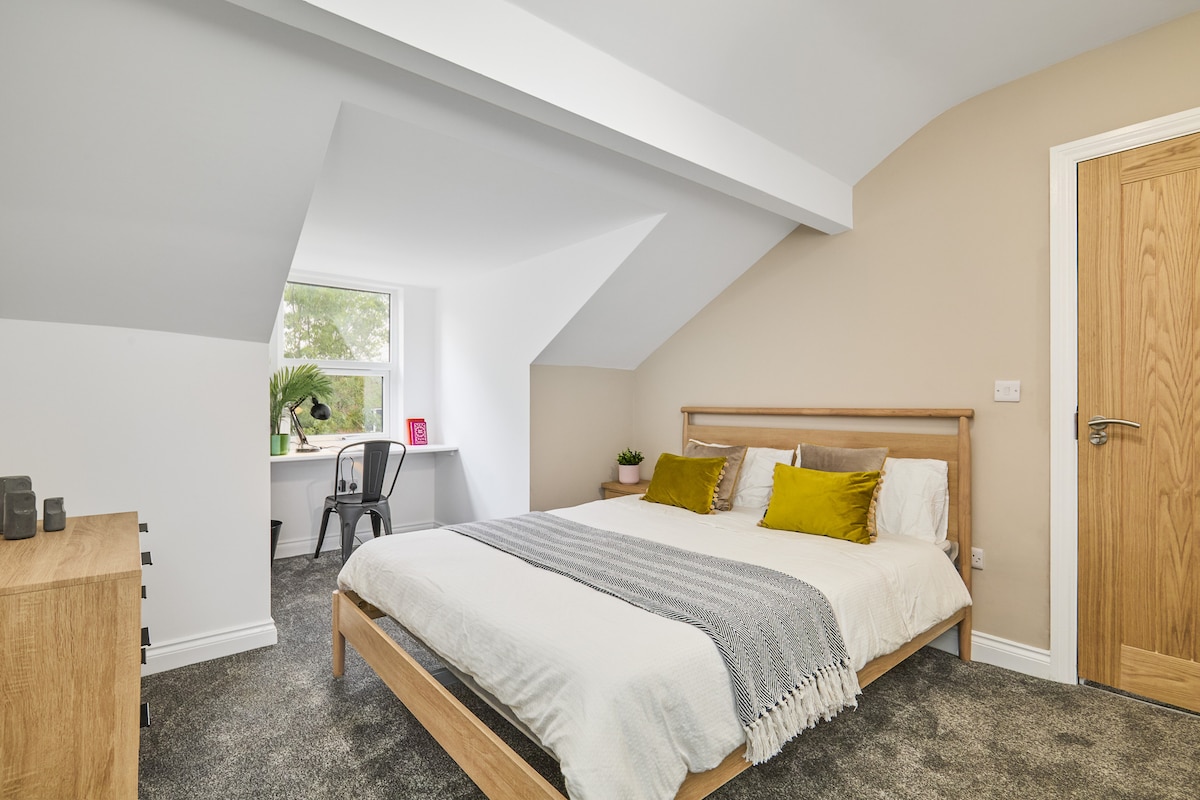 Este alojamiento con estilo es perfecto para una familia pequeña o dos parejas que comparten, ya que ofrece el espacio de dos camas dobles grandes y la privacidad de su propio baño. Situado en la frondosa Moortown, un pequeño barrio periférico de North Leeds, a solo 4 millas del centro de la ciudad de Leeds, es el lugar perfecto si quieres combinar una escapada a la ciudad con un retiro al campo, con Harrogate, Ilkley y los páramos de North Yorkshire a la vuelta de la esquina.