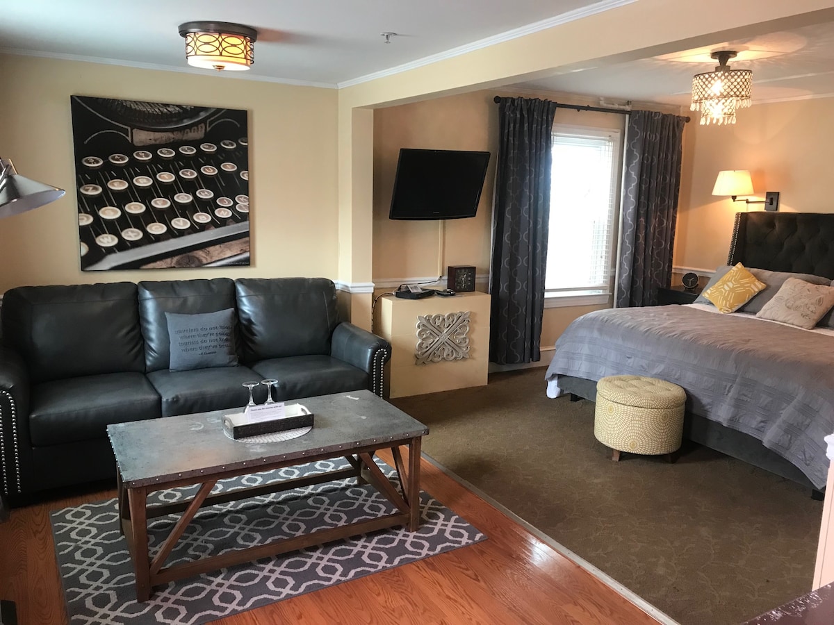 Experimenta el estilo de un hotel boutique en el centro de la ciudad, con la comodidad de una posada rural. Alójate y juega en una hermosa ciudad frente al mar en el galardonado Vandiver Inn, ubicado a pocas cuadras de la bahía de Chesapeake en el histórico Havre de Grace, Maryland. Rodeado de casas históricas, museos y cerca de golf, tiendas, tiendas de antigüedades, puertos deportivos y actividades orientadas al agua, el Vandiver consta de la histórica mansión Vandiver, las casas adyacentes Kent y Murphy, el pabellón durante todo el año y nuestros jardines. The Vandiver (Deluxe / 1st Floor Kent House): ¡el favorito de las parejas! Decoración contemporánea con sala de estar, cama tamaño king, escritorio, armario pintado a mano, nevera, bañera de hidromasaje grande, entrada privada, ecoFireplace y porche semiprivado con mesas y sillas. Cosas especiales: ecoFireplace / (grande) Bañera de hidromasaje/ microondas y mininevera / (semi) porche privado/cama tamaño king /Mantel de ladrillo