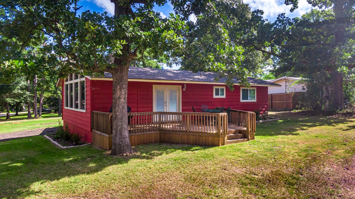 Acogedora cabaña en la esquina en Lake of the Pines. Ubicada en el muy deseable barrio de Crestwood y a menos de una milla de distancia de la rampa para botes en el puerto deportivo Johnson. Disfruta de la vida del lago desde esta pequeña cabaña roja con techos altos y abovedados que conducen grandes ventanales que se abren a una hermosa vista del lago. La casa tiene capacidad para 9 personas cómodamente con 2 dormitorios privados y una sala de estar abierta que incluye dos sofás que se pueden convertir en camas. ¡Disfruta de uno de los mejores lagos del este de Texas!
