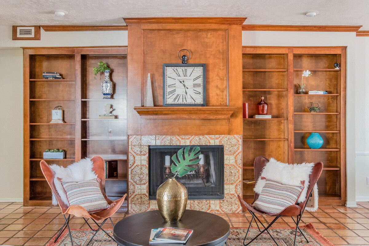 Elegant and luxurious Patio Home has a private pool, 2 working fireplaces, French antiques, gourmet kitchen, formal living and dining rooms, a spacious library with a Murphy bed and 3 and a half baths. There is also an 850 square foot Artist's studio. Three additional air mattresses can turn the studio into another bedroom. The private lap pool has a waterfall fountain as well as a patio. Additionally, there are 2 balconies, with grill and views of downtown. Fast Wi-Fi, 4,000 square foot house!