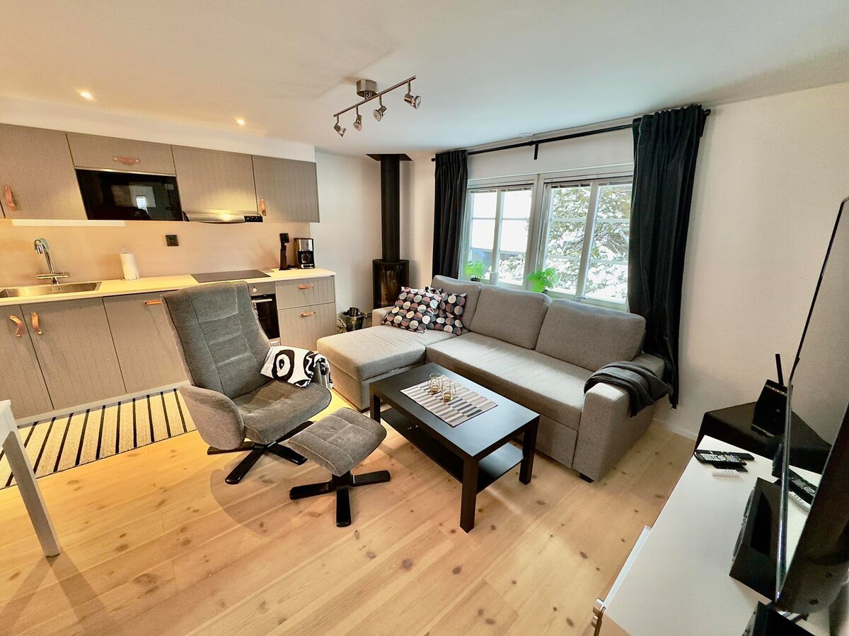 Apartamento de dos plantas en una zona rural a seis minutos de la pista de esquí, parque de bicicletas, Vildriket, pista de ciclismo y pista de hielo para correr y esquiar. En verano, puedes practicar ciclismo de montaña nada más salir de la puerta. Construido en 2020, salón con cocina y comedor para seis personas más trona, dos dormitorios, salón con sofá y sillones, baño con ducha, sala de televisión con sofá cama doble, wifi, carga para coche eléctrico.