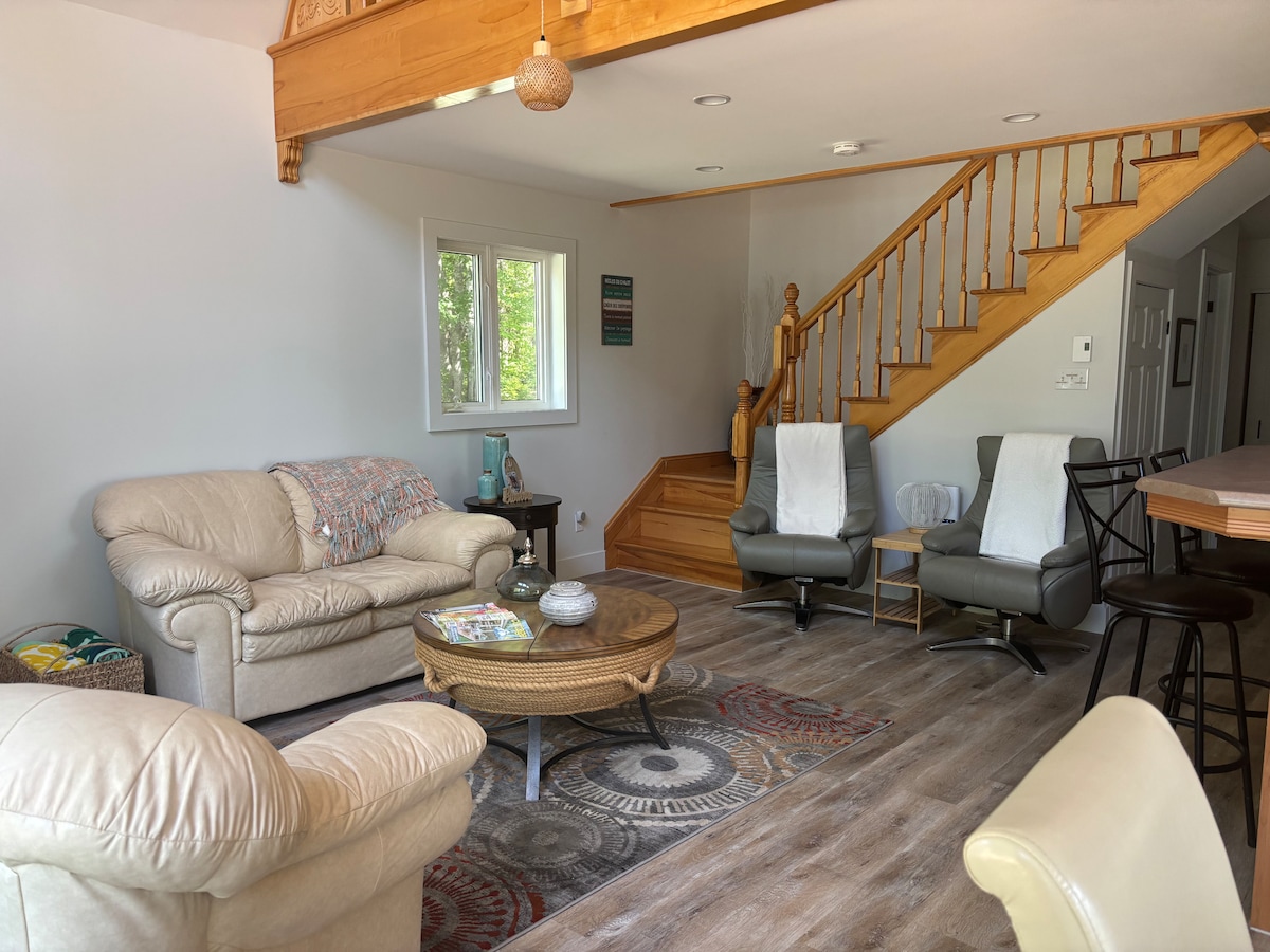 3 double and 1 single beds in 4 in private rooms, sharing a living room and full kitchen, beside the beautiful Tracadie River.