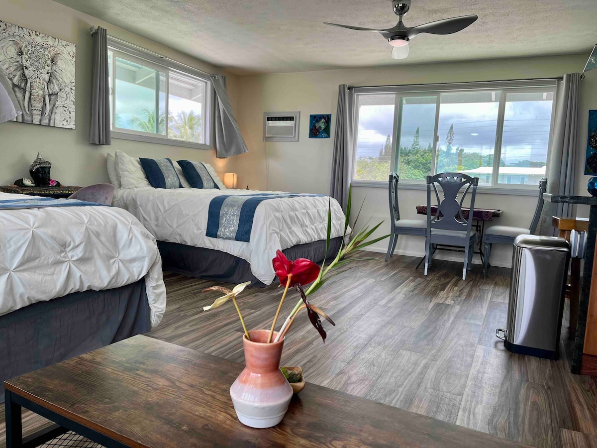 ¡Dormitorio enorme para 6 personas! ¡Respetuoso con el presupuesto! ¡Las palabras no pueden describir su belleza! ¡270 grados de ventanas! ¡Con vistas al océano! ¡No compartir paredes! Mucho espacio se suma a este ático privado como el segundo piso.Las comodidades incluyen cocina completa, Netflix, Internet rápido, escritorio, baño privado, nevera, sofá, hermoso patio, estanques koi, todo en un acre de tierra. Nuevo aire acondicionado. Baño privado. ¡Únete a nosotros!