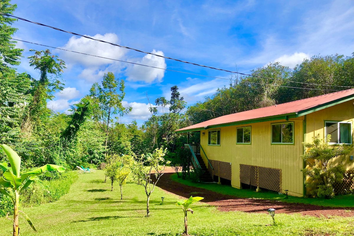 Relájate con toda tu familia en nuestra tranquila casa tropical. Nuestra casa está en 9 acres de selva. La casa está llena de arte local, una cocina totalmente equipada, equipo de playa, árboles frutales y un gran lanai (patio). Tenemos una ubicación céntrica en el lado este de la Isla Grande entre el volcán Nat. Parque y Hilo y a solo unos minutos de la autopista 11. Totalmente equipado con todo lo necesario. ¡Déjanos ser tu hogar lejos de casa en Hawái!