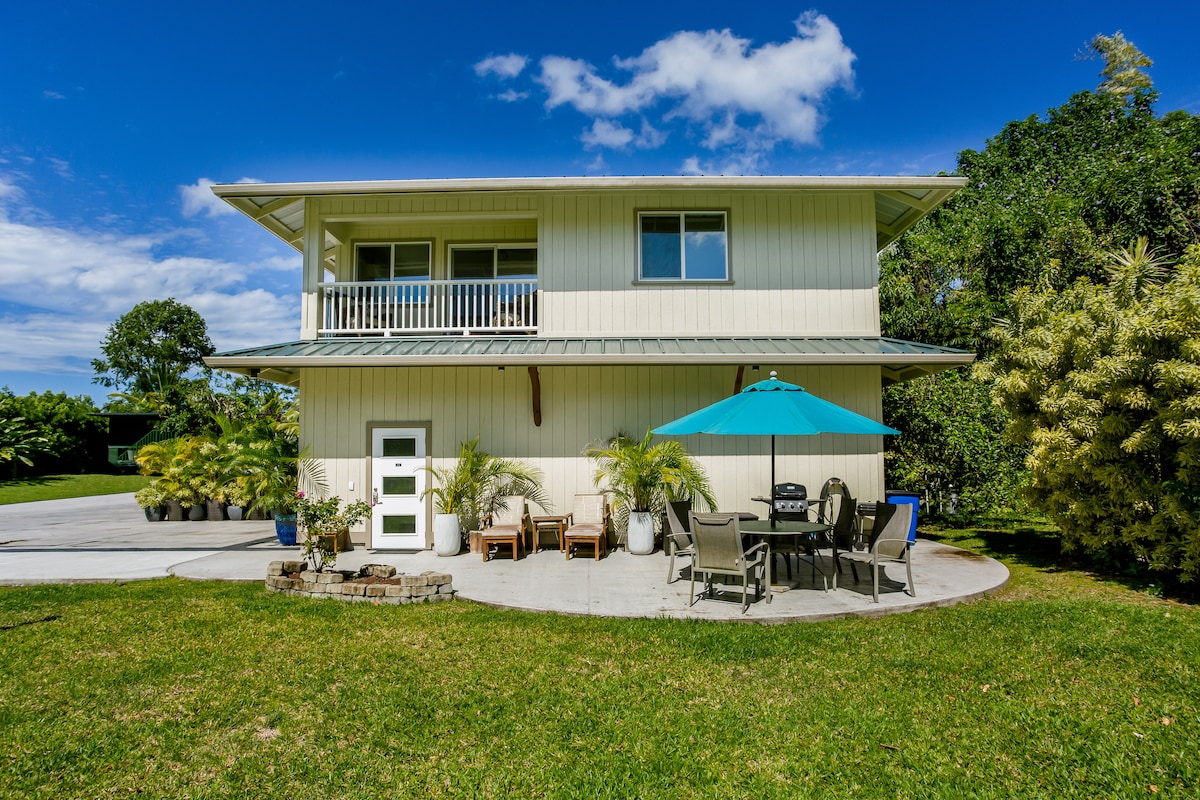 La NUEVA MARCA Pua Hale, impresionante, espaciosa unidad de condominio de arriba con toneladas de clase. Cocina completa abierta con todas las comodidades, baño privado completo a medida, extremadamente lujosa espuma viscoelástica cama tamaño king. ¡Ponte cómodo en el espacio de lanai o diviértete en la cancha de voleibol/bádminton! Date un chapuzón al atardecer en el jacuzzi bajo los mangos y disfruta al aire libre. ¡Disfrute del cercano Parque Nacional de los Volcanes, piscinas de mareas, caminatas por la playa, mar y cascadas!