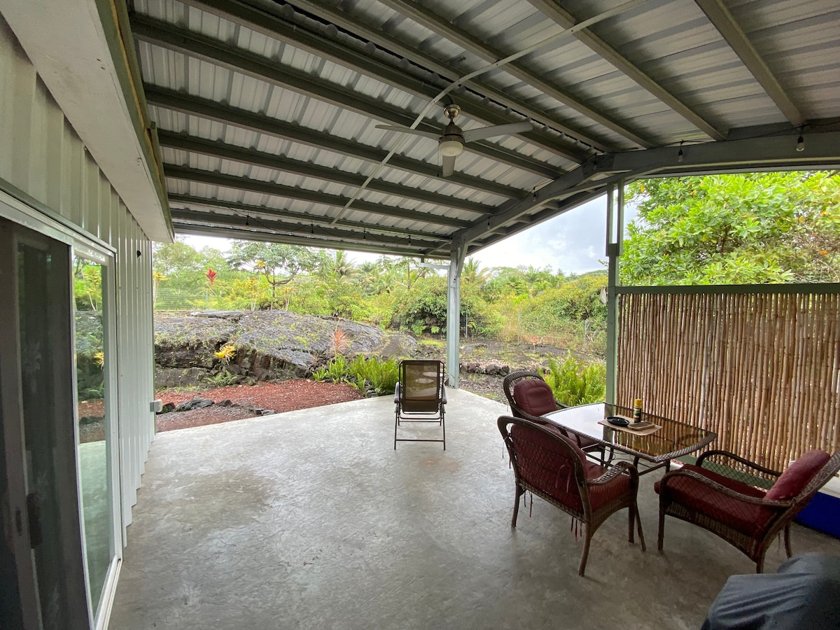 Estudio aislado con cocina completa, techos abovedados de madera con vigas a la vista, ventilador de techo, iluminación acogedora, gran lanai envolvente, tema de color coordinado, vistas al jardín, caminos pavimentados, ubicación céntrica para visitar el Parque Nacional de los Volcanes, Mauna Kea, Hilo, Pahoa y Kalapana. Ubicado en un barrio rural y tranquilo y a unas 1,5 millas de la costa del acantilado de lava.