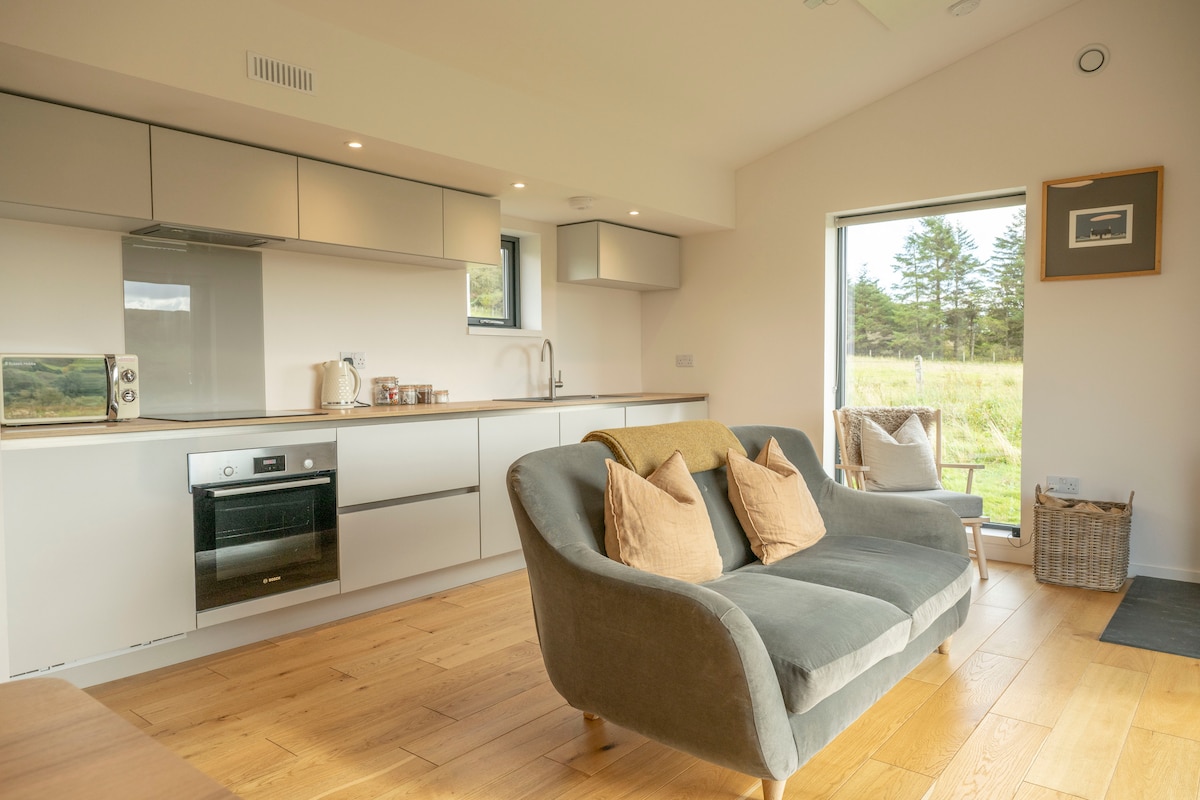Norskye Bothy es un refugio de inspiración escandinava en el corazón de la isla de Skye. Nuestra cabaña ecológica de diseño arquitectónico tiene capacidad para dos personas, con vistas ininterrumpidas a la colina y al lago. La cabaña cuenta con una sala de estar, cocina y comedor de planta abierta con un dormitorio tamaño king separado y un baño con ducha. Tenemos una ubicación céntrica, a solo 5 millas de Portree, el punto de partida perfecto para explorar o relajarte mientras visitas la Isla de Skye. *No apto para bebés* Licencia : HI-30725-F Calificación EPC: D