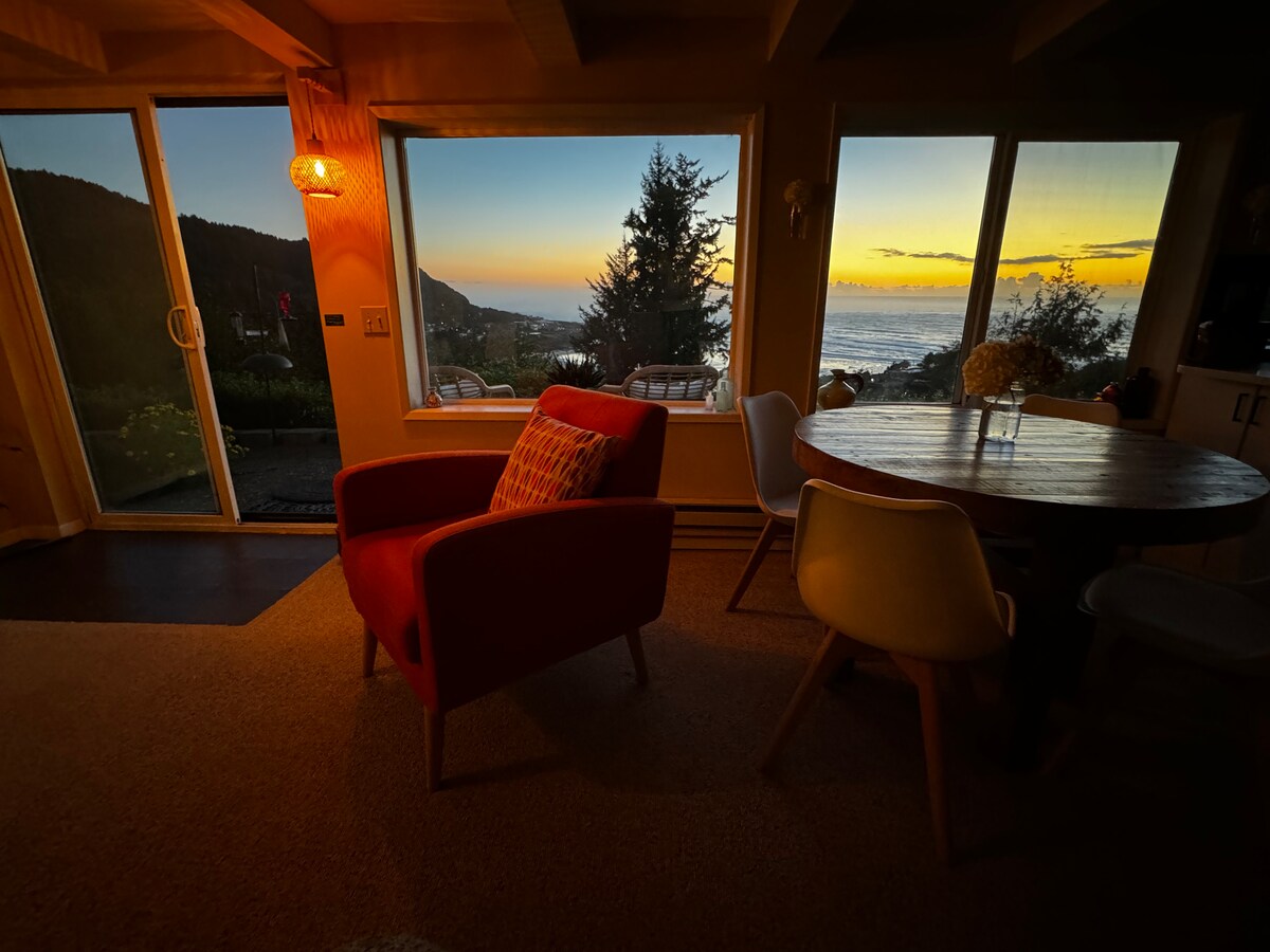 Ubicado en un bosque en la ladera de una colina, este refugio ofrece vistas al mar, al río y a la montaña desde todas las habitaciones. A diez minutos a pie de la playa, el río, cafeterías, restaurantes y supermercado. Lo suficientemente lejos de la 101 para que todo lo que oigas sean olas rompiendo y pájaros trinando. La ruta de senderismo justo detrás de la casa conduce al famoso sendero 804, al sendero de la costa de Oregón, al sendero de Amanda y al cabo Perpetua.