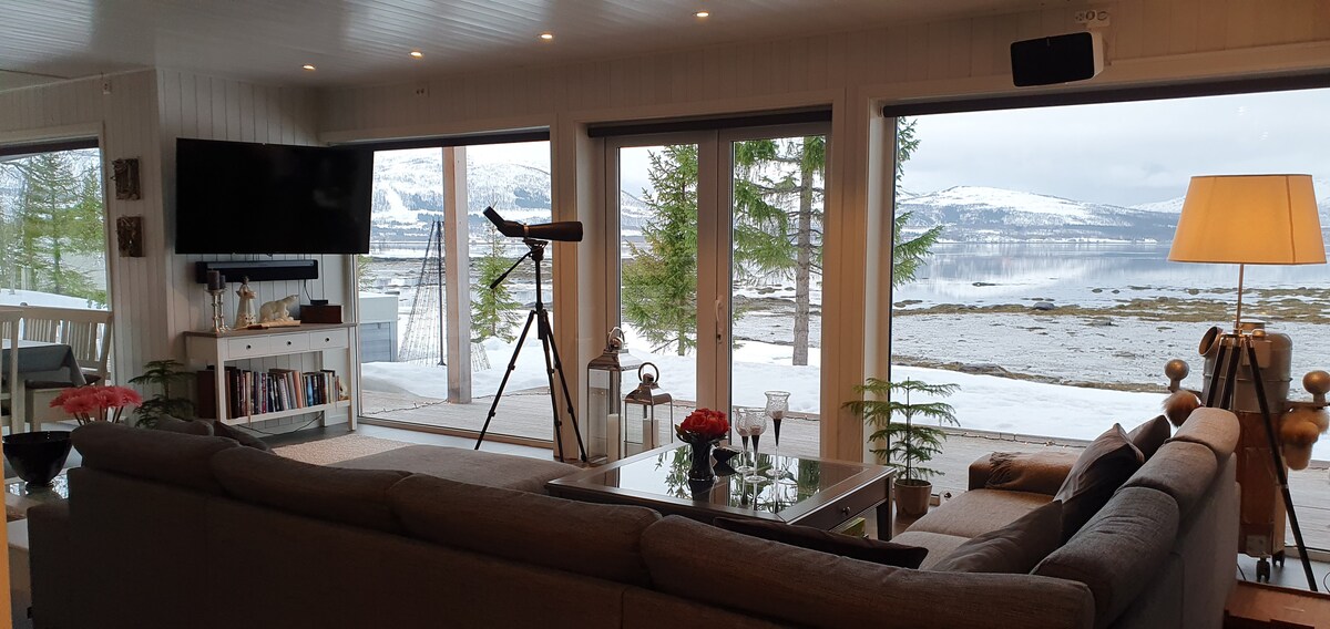 Espectacular casa de nueva construcción (2018) en una zona encantadora y tranquila con hermosas vistas al fiordo/mar, montañas y bosque en Kvaløya /Tromsø. Puedes ver la hermosa luz del norte/ aurora boreal desde la enorme ventana (10 metros cuadrados), sentarte en la sala de estar con una taza de té o café en la mano:-) Este es un lugar perfecto para los turistas que quieren ver la luz del norte, las ballenas en el fiordo en el invierno, senderismo/ esquí en las montañas o todo lo demás que quieras en esta encantadora ciudad.