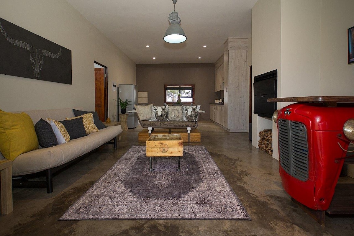 Disfruta de una experiencia de lujo en este céntrico alojamiento. Relájate después de un largo día junto a una acogedora chimenea o mira la televisión en un televisor inteligente de pantalla grande o haz un braai al aire libre en un pozo de fuego bien diseñado. Una cocina totalmente amueblada, ropa de cama fresca y limpia y una ducha limpia garantizarán una estancia cómoda. Un buen descanso nocturno en nuestra cama tamaño king te hará brillar al día siguiente. La unidad está equipada con agua de repuesto (tanque jojo) y un calentador solar. La energía de respaldo garantiza energía las 24 horas, los 7 días de la semana para la televisión y el wifi.