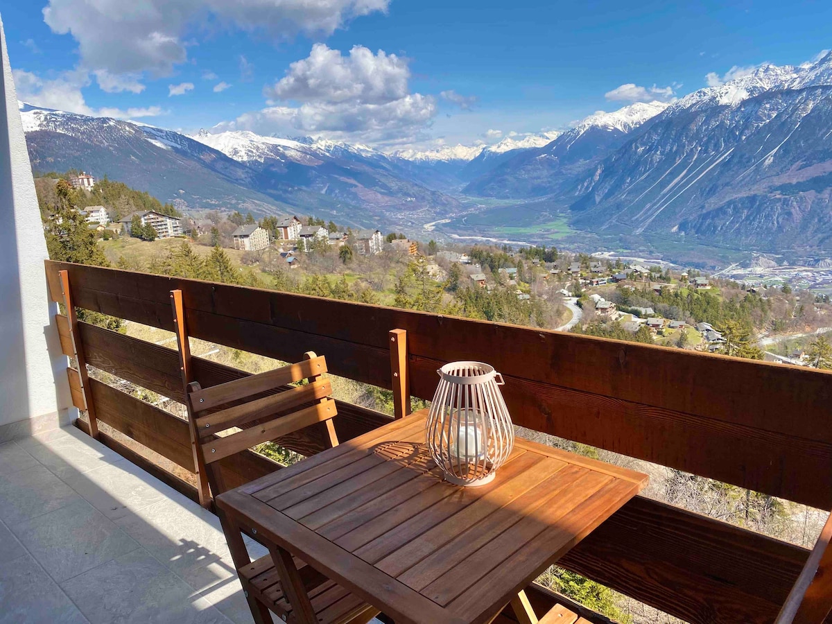 Hermoso, soleado y moderno estudio con excelentes vistas a la montaña y al valle. Todos los puntos de partida cercanos. Bonito y soleado balcón. Cocina moderna bien equipada, baño con ducha/bañera, inodoro, lavabo. TV, WiFi/NETFLIX. Estacionamiento gratuito con tarjeta de estacionamiento frente a la casa. A pocos pasos del centro de Montana, autobuses gratuitos. Habitación de esquí/lavandería en la casa. En el soleado corazón de los Alpes suizos. ¿Senderismo? ¿Esquí? ¿Golf? ¿Ciclismo? ¿Disfrutas de la naturaleza? ¿Nadar? Pasea por los hermosos lagos. Excelentes restaurantes, tiendas