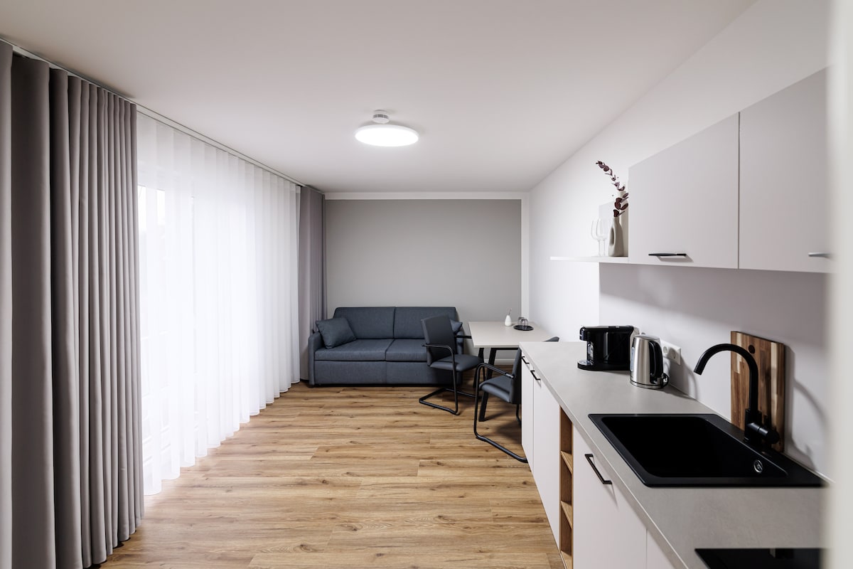 Die Kurpark Suites verbinden stilvolles Design mit funktionaler Ausstattung. Jede Suite verfügt über eine eigene Kitchenette und moderne Möbel, die Ihren Aufenthalt so angenehm wie möglich machen. Helle Räume, warme Farben und viel Liebe zum Detail machen unsere Suiten zu einem Ort, an dem Sie sich sofort wohlfühlen. Für erholsame Tage, ungestörtes Arbeiten oder entspannte Auszeiten.