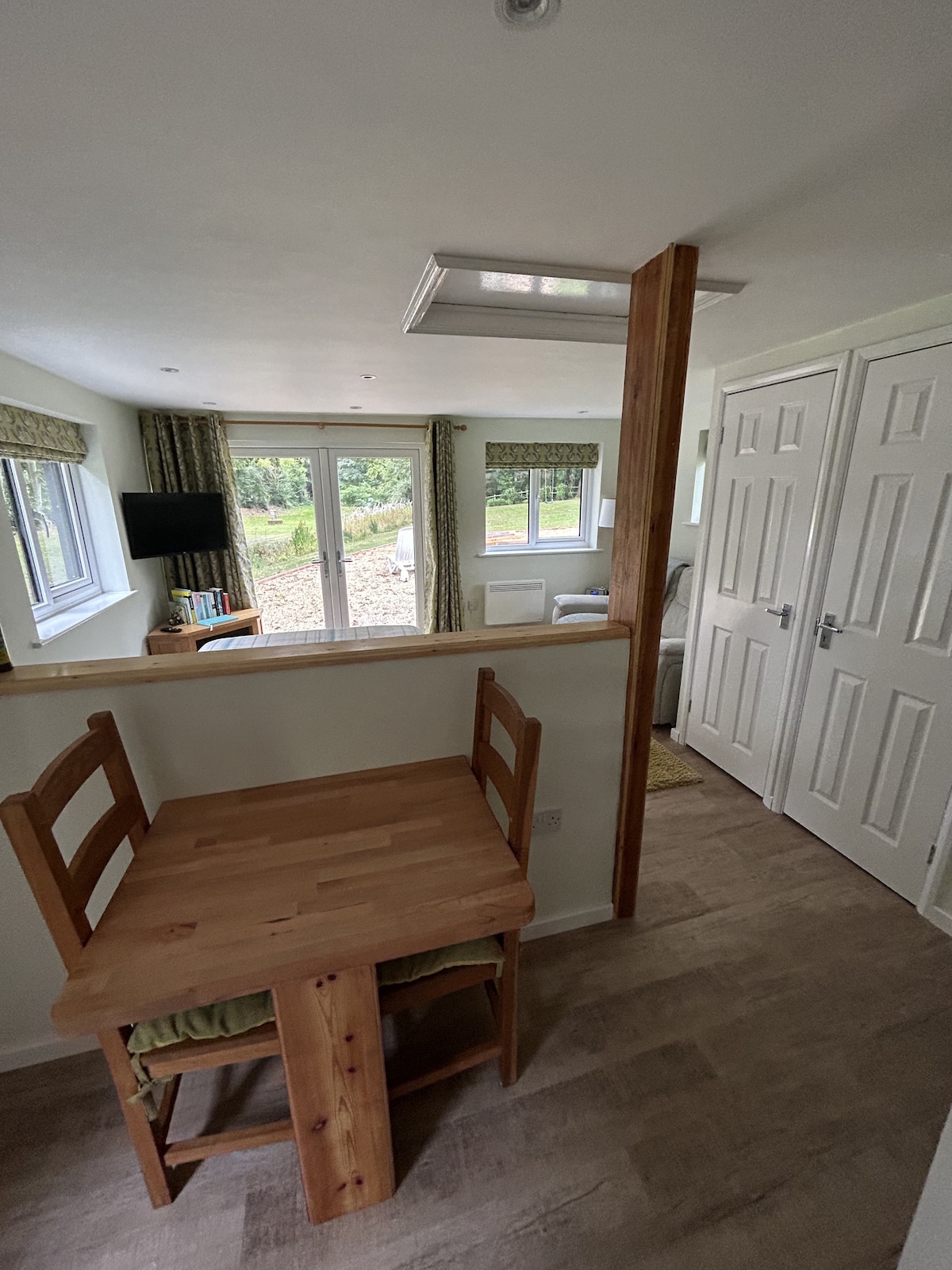 A comfortable studio apartment set apart from the main house with off road parking right outside. Guests have their own front door, and there is a private deck looking out over neighbouring farmland . The studio has a private shower room, fresh towels and sheets are provided. There is a small kitchen area with a microwave, a toaster and an air fryer. We can arrange check in and check out times to suit us both, and we are happy to advise on the local area. Please ask!