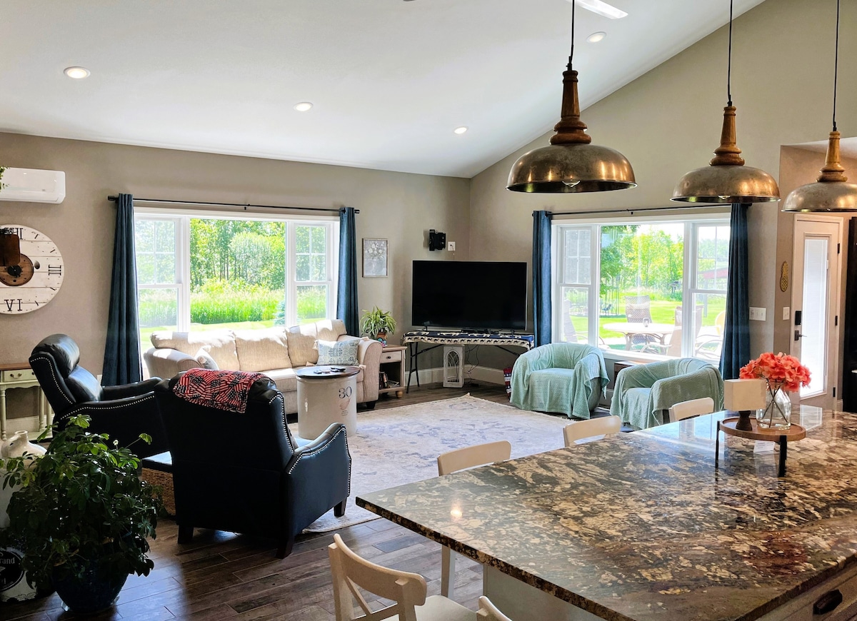 ¡Bienvenido a lo mejor que la vida en el campo tiene para ofrecer! Descansa y relájate con comodidad mientras disfrutas de las tranquilas vistas al campo. Esta espaciosa y cómoda casa moderna se encuentra en 5 acres de serenidad privada y tranquila. Hay mucho espacio para toda la familia en esta casa totalmente equipada y repleta de servicios. Tendrás acceso gratuito a toda la propiedad, que cuenta con un porche delantero cubierto, un acogedor patio trasero y un exclusivo «Cornzebo».